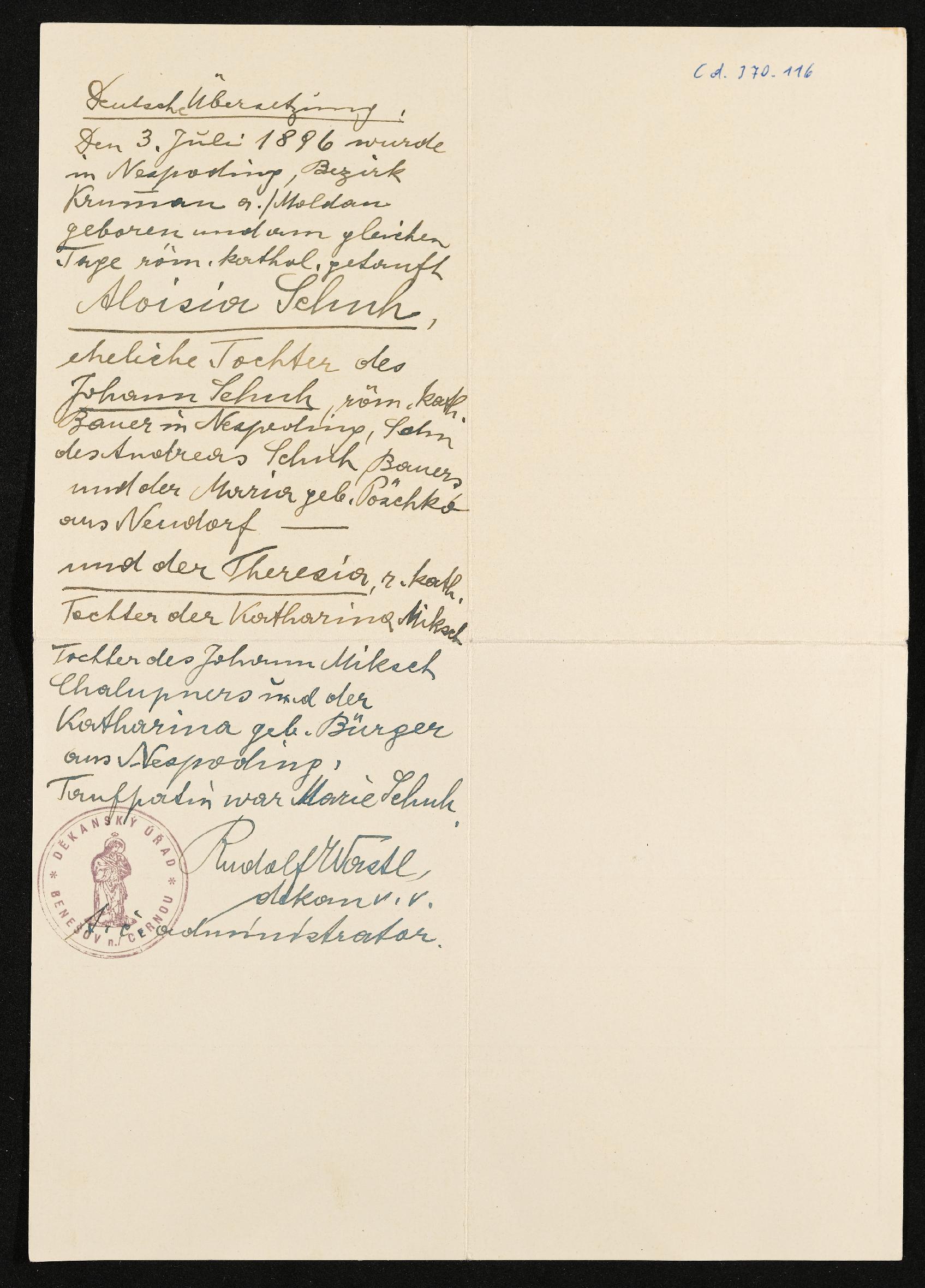 | Beschreibung | Geburtsurkunde Aloisia Schuh, geboren am 3. Juli 1896, ausgestellt am 6. Juni 1946 |