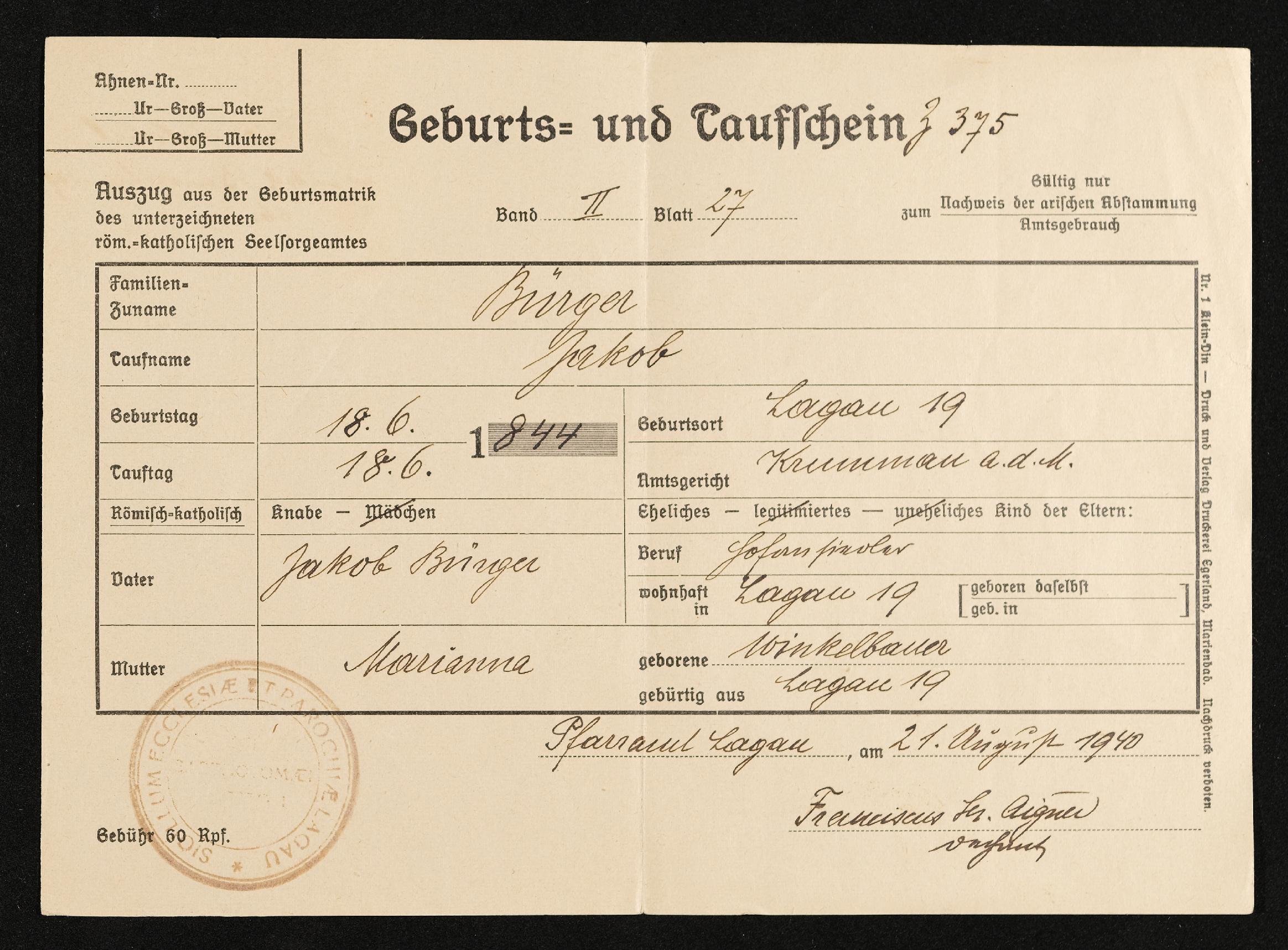 | Beschreibung | Geburts- und Taufschein Jakob Bürger, geboren am 18. Juni 1844, ausgestellt am 21. August 1940 |