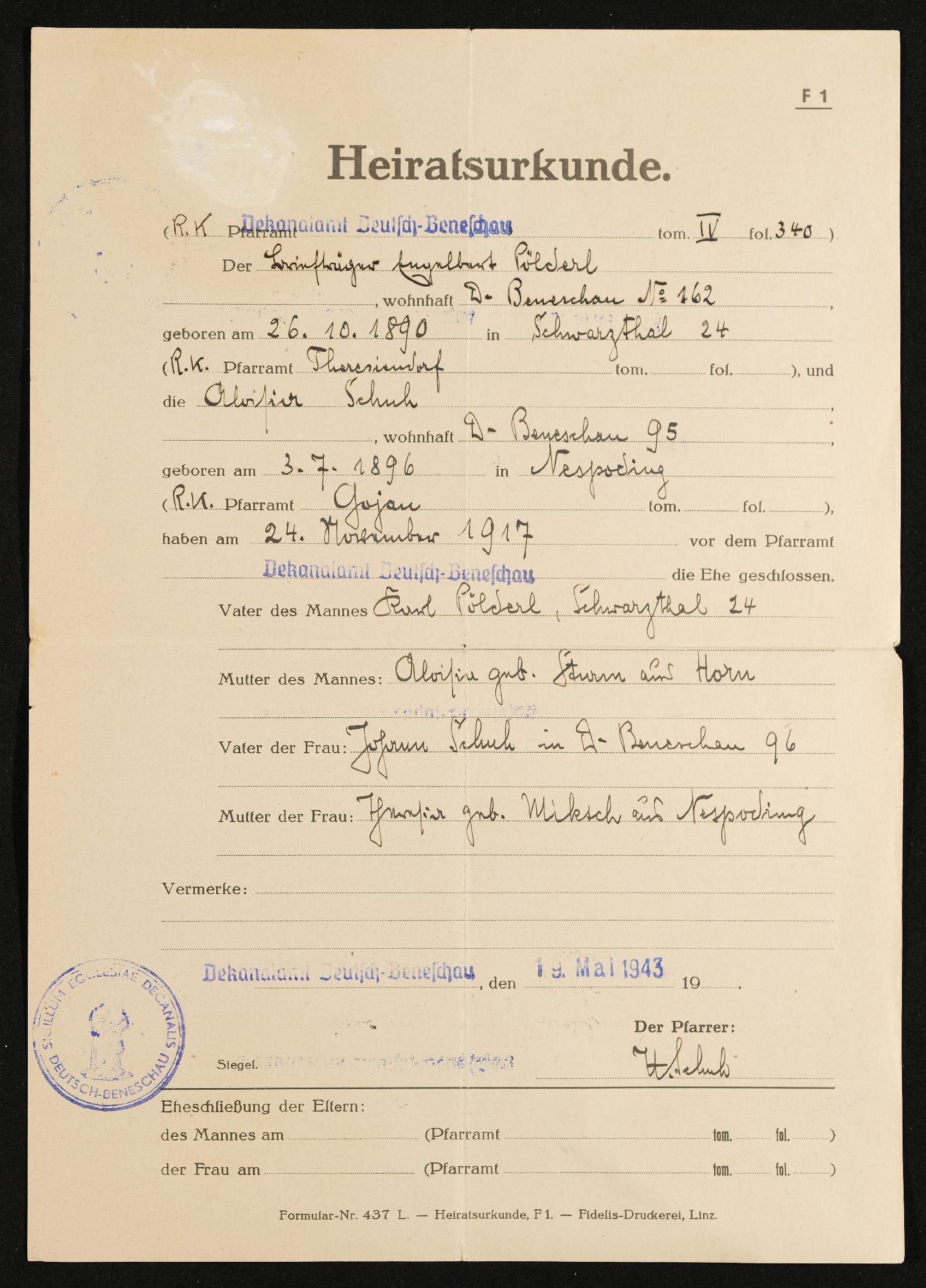 | Beschreibung | Heiratsurkunde Engelbert Pölderl und Alosia Schuh, Hochzeit am 24. November 1917, ausgestellt in Deutsch-Beneschau am 19. Mai 1943 |