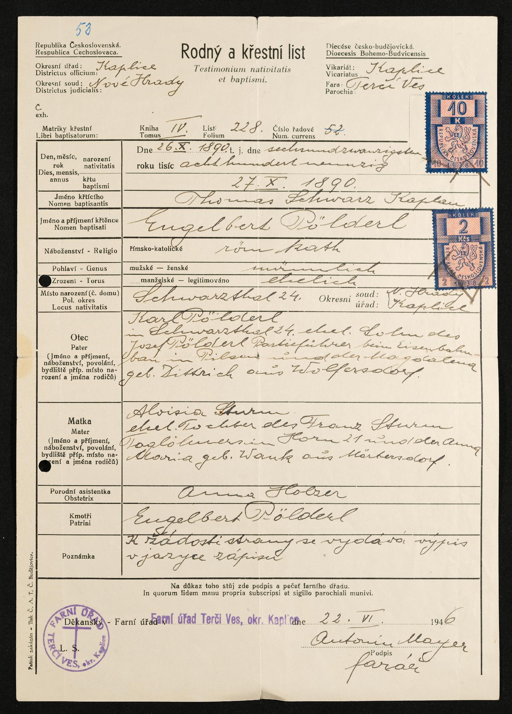 | Beschreibung | Geburtsurkunde Engelbert Pölderl, geboren am 26. Oktober 1890, ausgestellt in Kaplitz am 22. Juni 1946 |