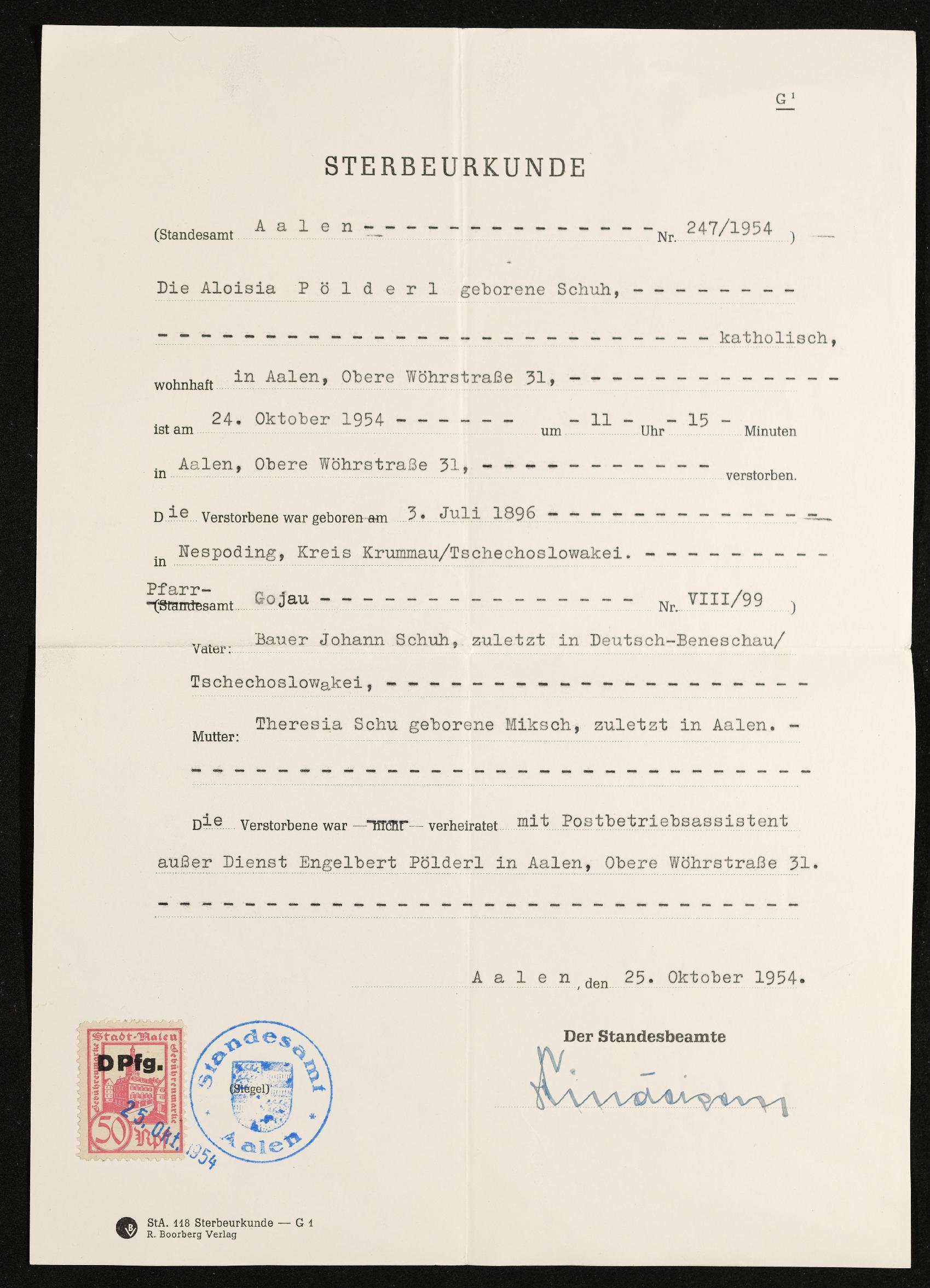 | Beschreibung | Sterbeurkunde Aloisia Pölderl (geb. Schuh), verstorben am 24. Oktober 1954, ausgestellt in Aalen am 25. Oktober 1954 |