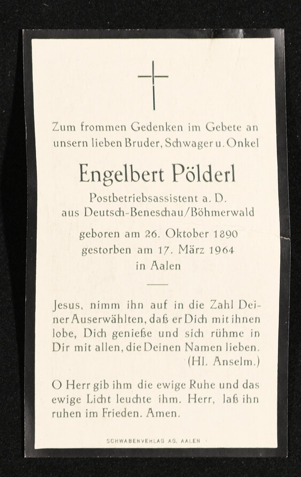 | Beschreibung | Partezettel Engelbert Pölderl, Postbetriebsassistent a.D., Aalen, 17. März 1964 |