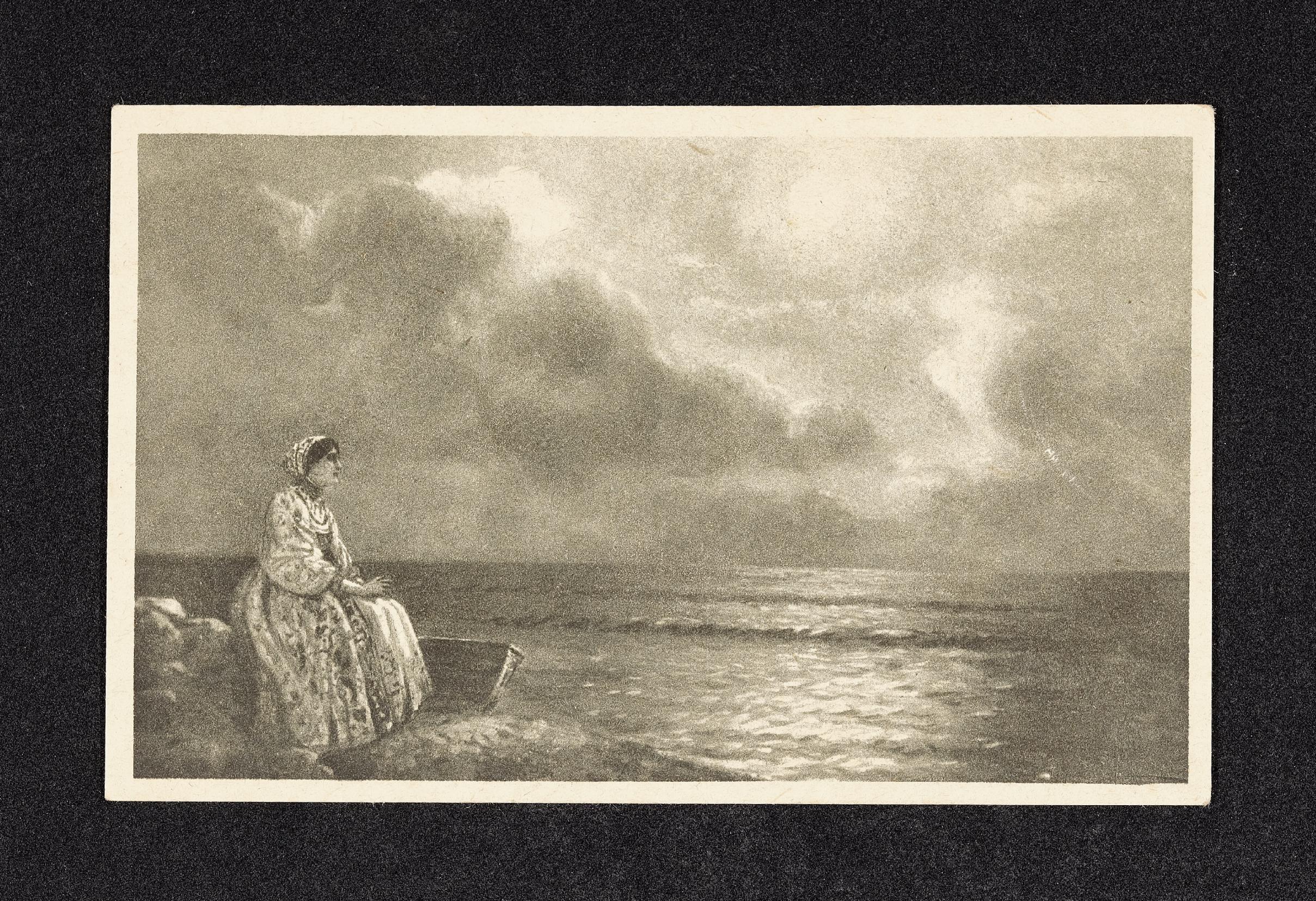 | Beschreibung | Unbeschriftete Ansichtskarte mit einer Zeichnung zu dem Thema Abendstimmung am Meer, Frau am Ufer, Ruderboot |