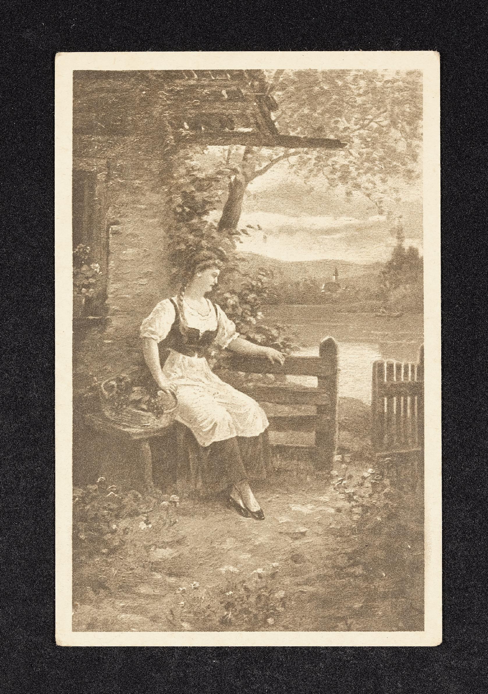 | Beschreibung | Unbeschriftete Ansichtskarte mit einer Zeichnung zu dem Thema In Erwartung, Frau sitzt auf einer Bank vor einem Haus an einem Gewässer mit einem Korb Trauben |