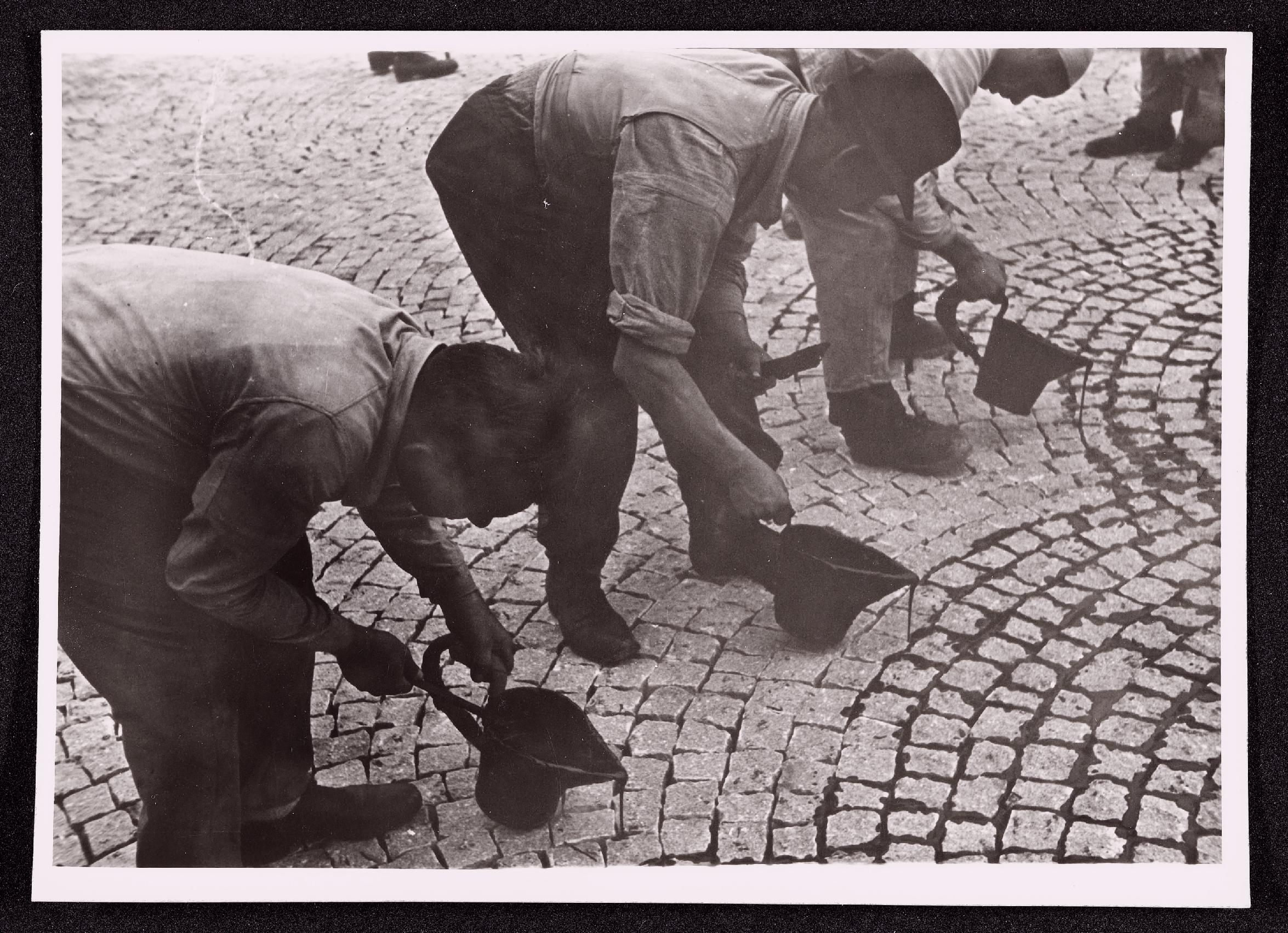 | Beschreibung | Straßenbau, Verfugen von Pflastersteinen |