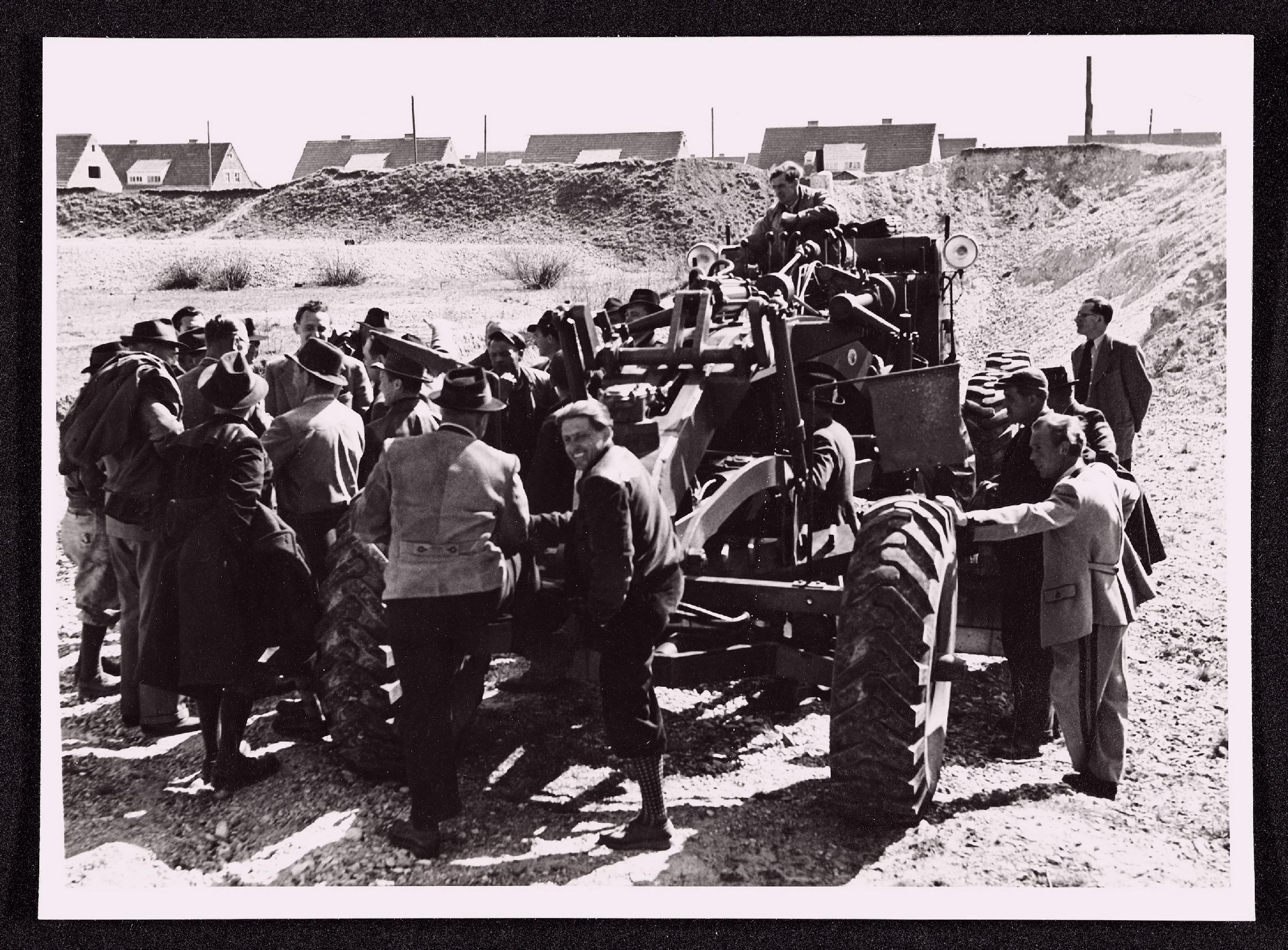 | Beschreibung | Straßenbaumaschine mit Arbeitern und Firmenleitung |
