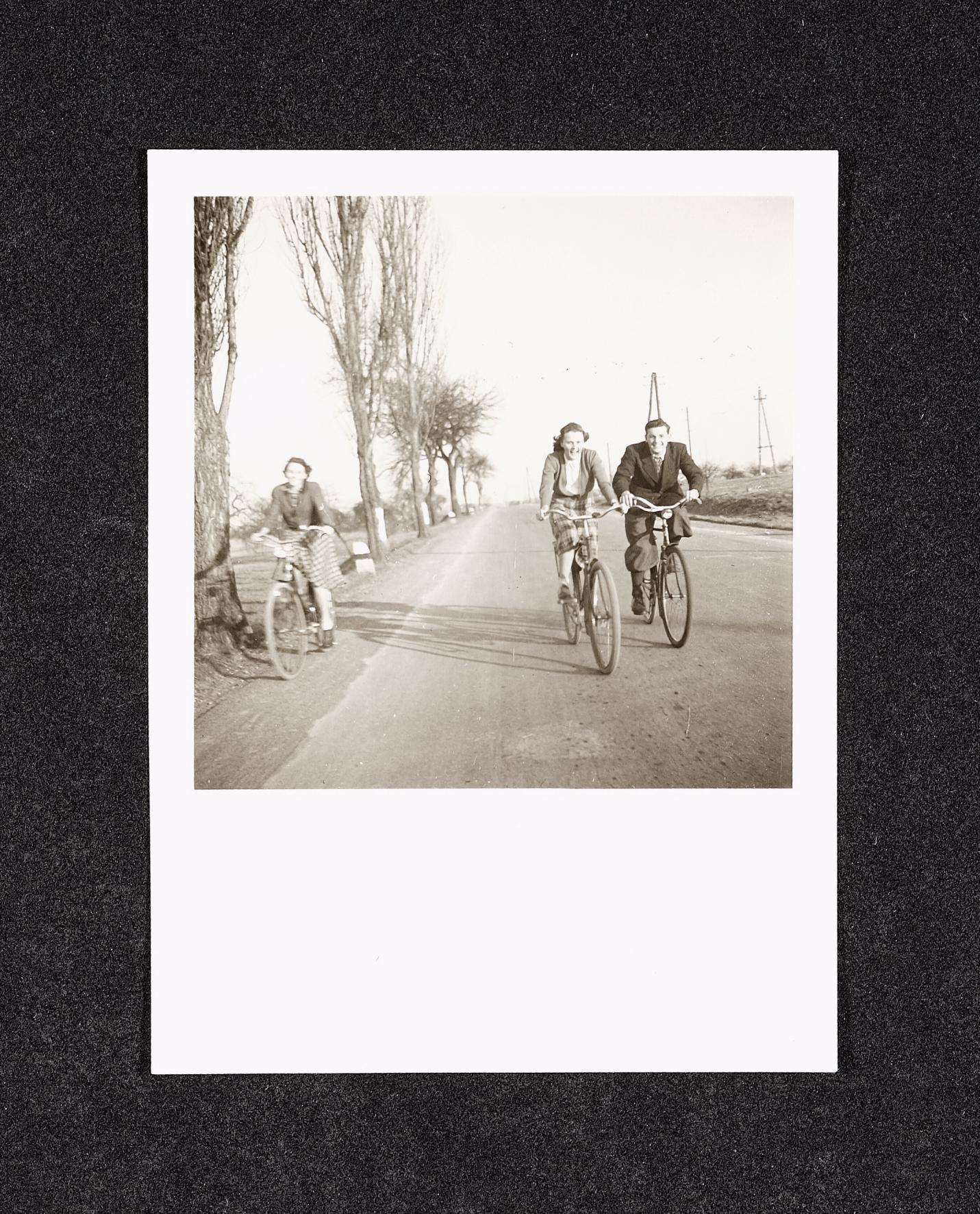 | Beschreibung | Zwei junge Frauen und ein junger Mann beim Radfahren auf einer mit Bäumen gesäumten Straße in Oberösterreich, Umgebung wirkt eher flach. Foto wurde auf der Rückseite nach 1945 datiert. |