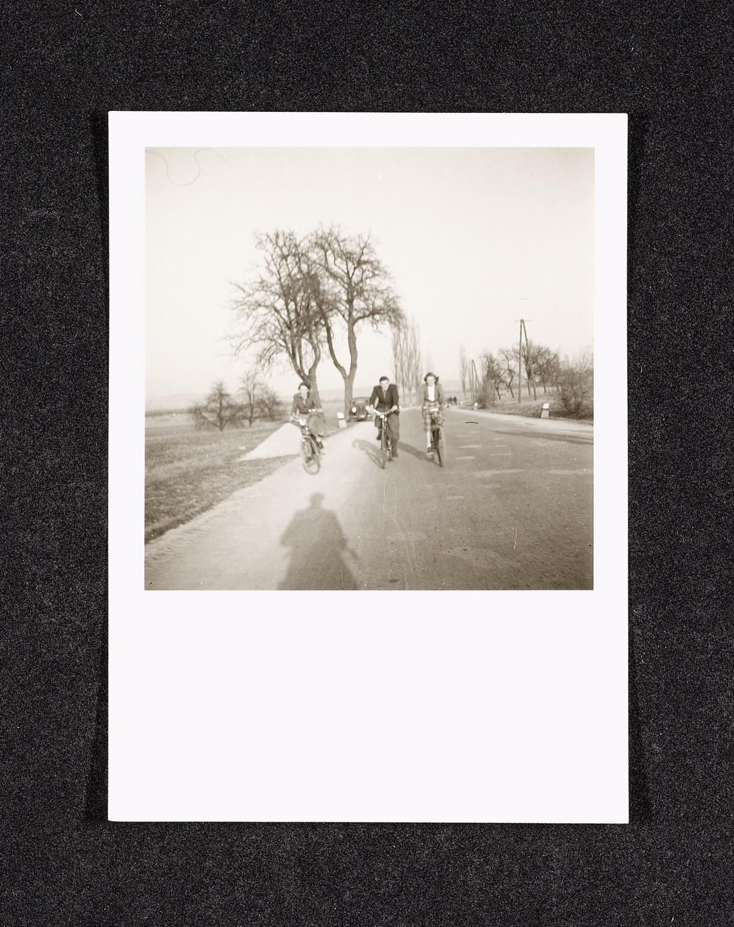| Beschreibung | Zwei junge Frauen und ein junger Mann mit Fahrrädern auf einer mit Bäumen gesäumten Straße in einer flachen, ländlichen Umgebung. Der Schatten des ebenfalls auf einem Rad sitzenden Fotografen ist zu sehen. Foto wurde auf Rückseite nach 1945 datiert. |