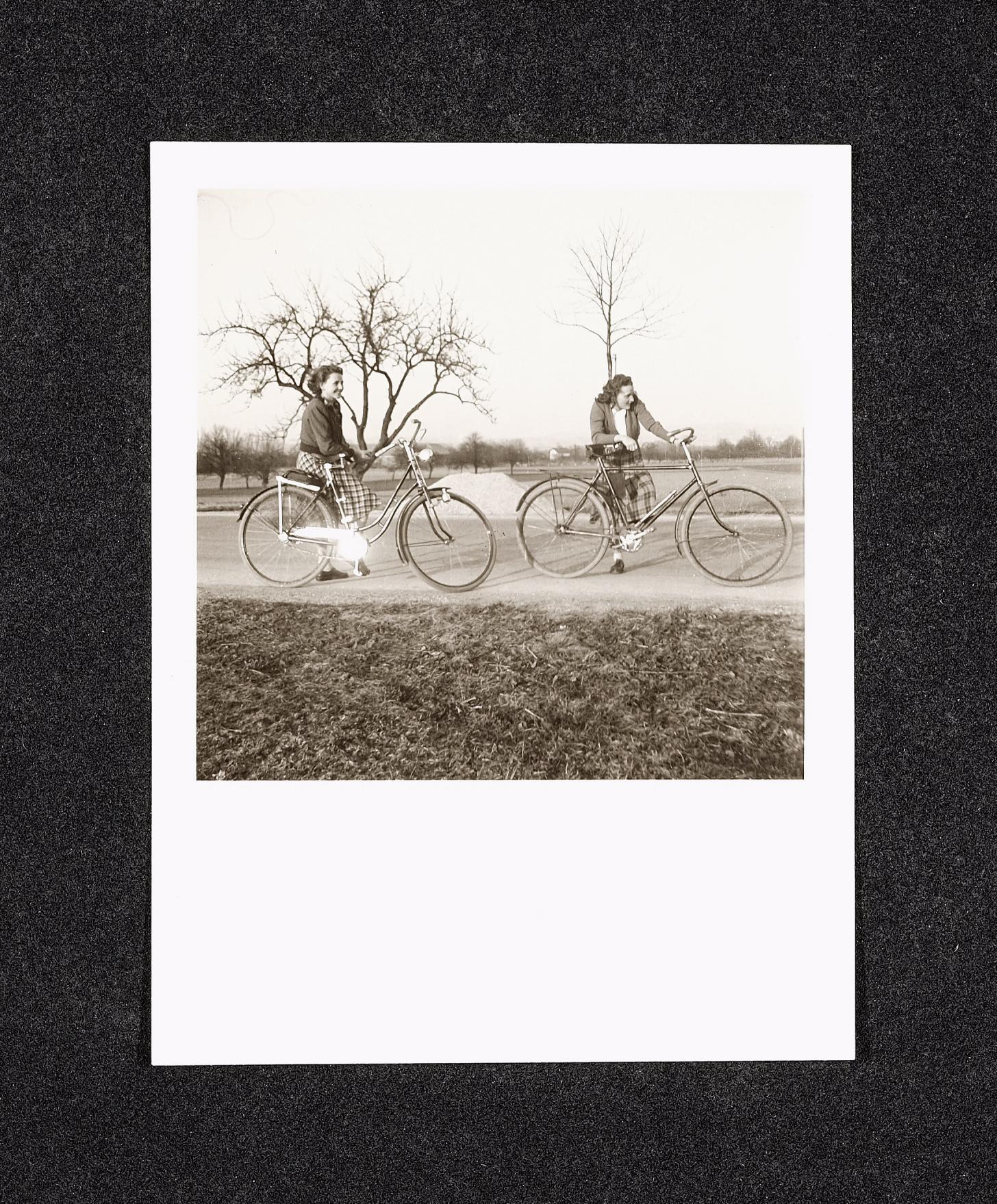 | Beschreibung | Zwei junge Frauen mit ihren Fahrrädern, ein Damenrad und ein Herrenrad, auf einer Sraße in einer flachen, ländlichen Gegend, im Hintergrund ein Schotterhaufen, der vielleicht ein Hinweis auf die Reparatur der Straße oder des Banketts sein kann. Foto wurde auf Rückseite nach 1945 datiert. |