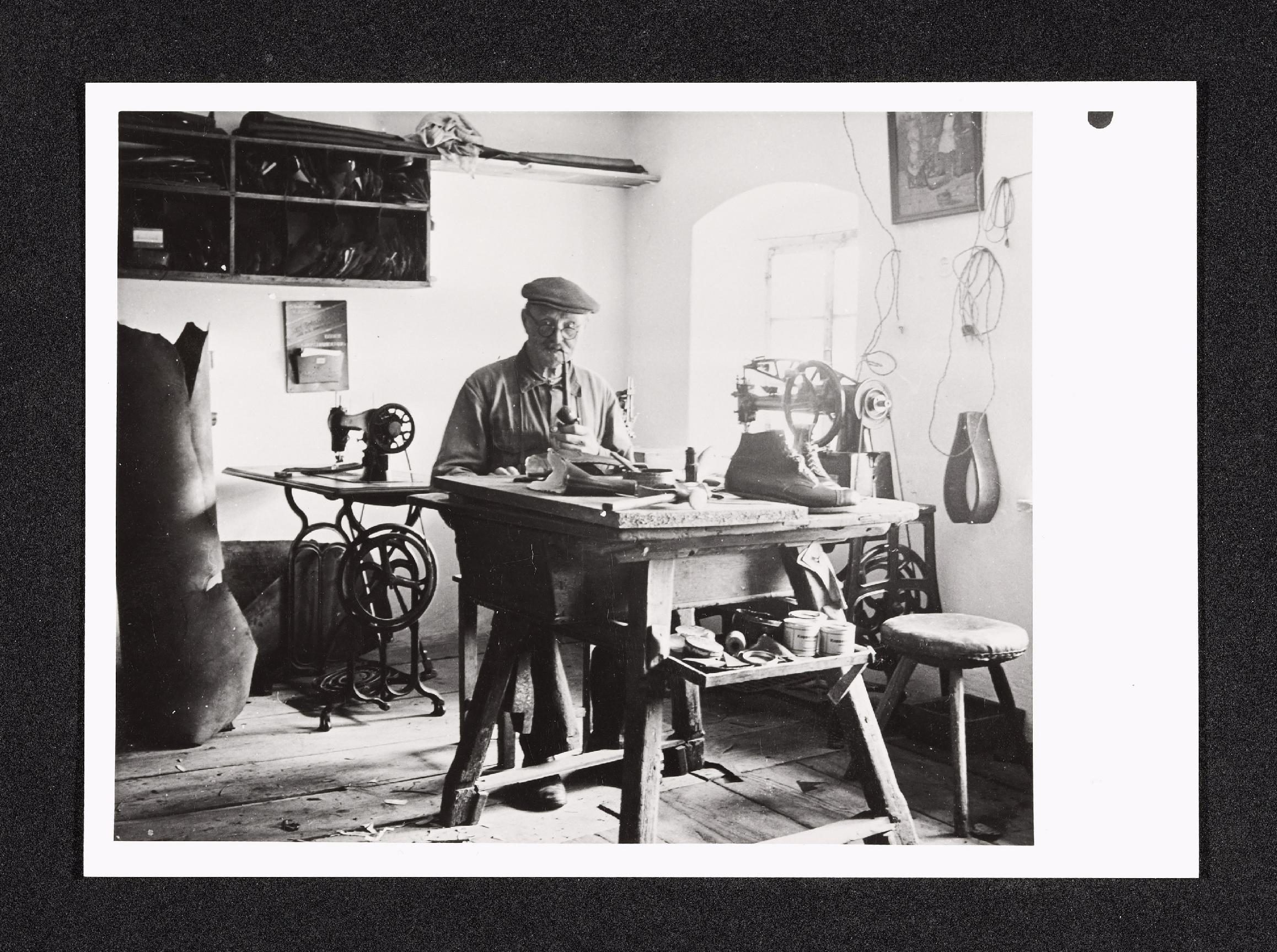 | Beschreibung | Schuster Grasböck bei seiner Arbeit, Werkzeug und Schusternähmaschinen liegen gut sichtbar vor ihm auf dem Arbeitstisch |