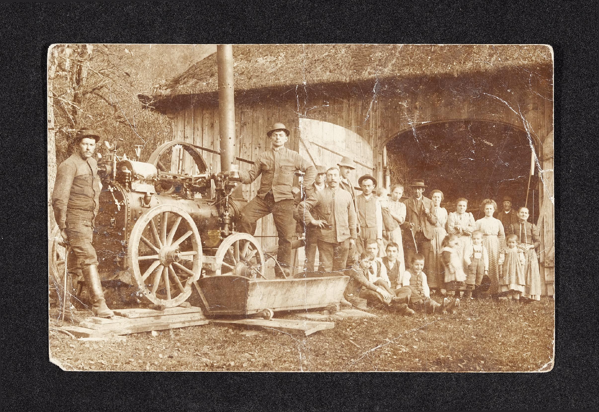 | Beschreibung | Bauernfamilie mit Dienstboten vor einer Dampfdreschmaschine |