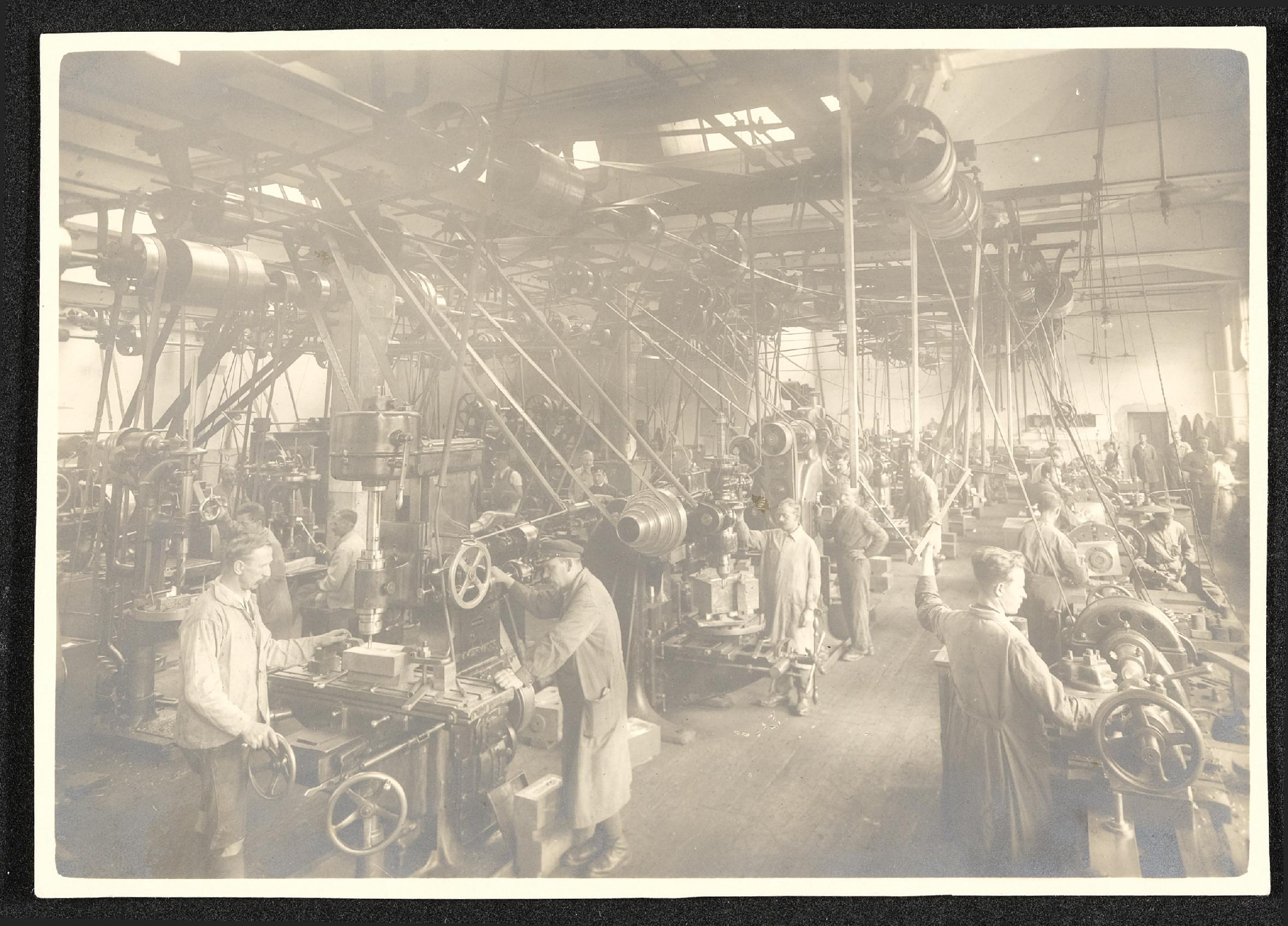 | Beschreibung | Arbeiter in der Schlosserei der Österreichischen Waffenfabriksgesellschaft an Maschinen mit Transmissionsriemenantrieb |