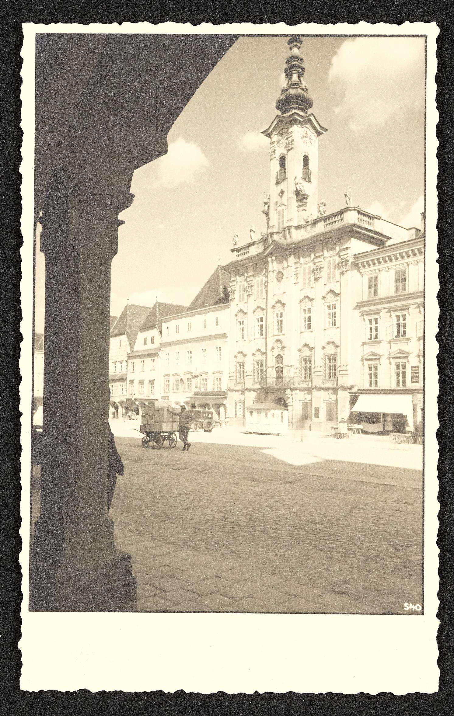 | Beschreibung | Stadtplatz in Steyr mit Rathaus, Mann mit vollgepacktem Lastenleiterwagerl, im Hintergrund ein Automobil |