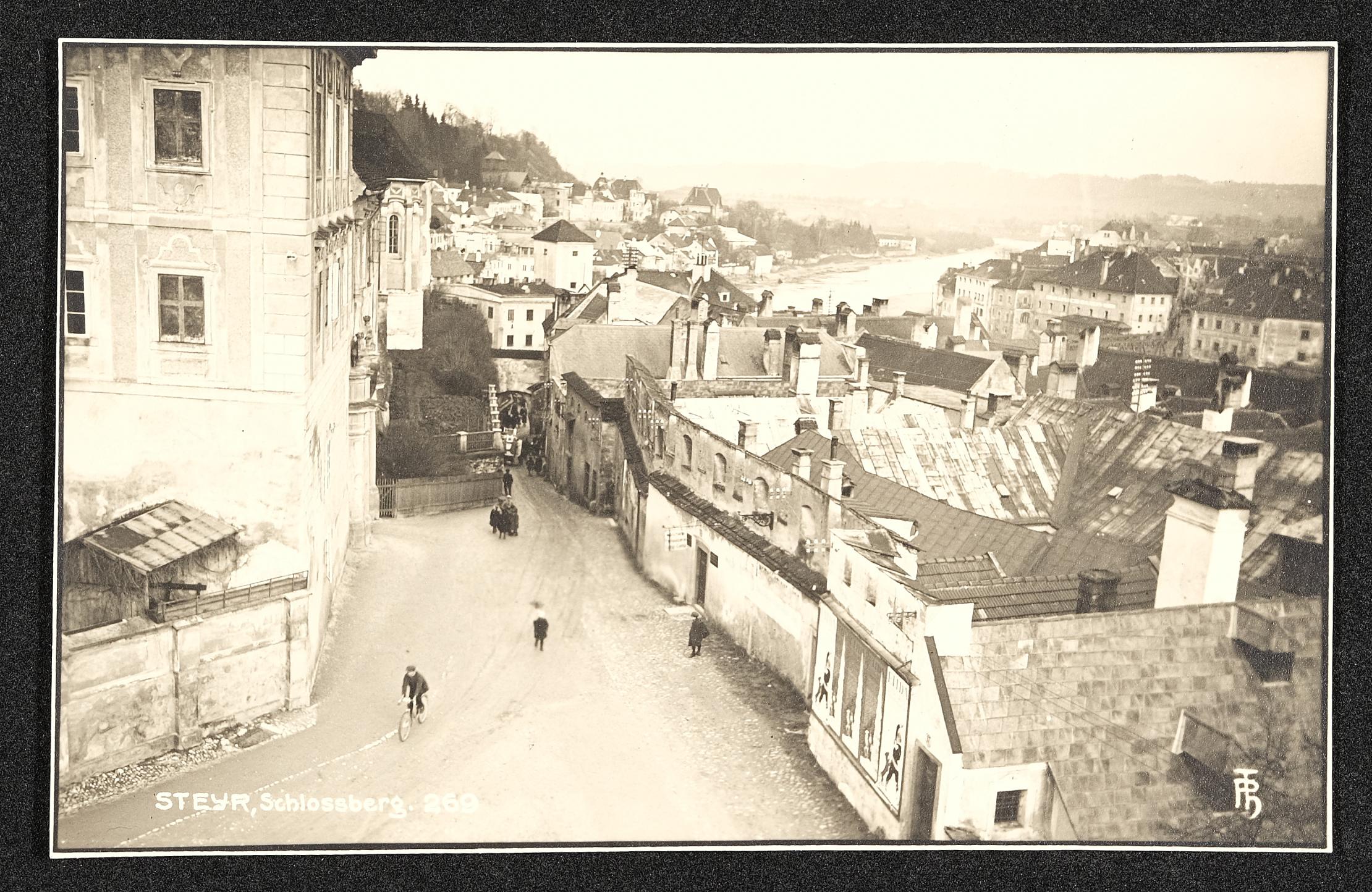 | Beschreibung | Berggasse mit Blick auf Enns, den Stadtteil Ennsdorf und das alte Werndl'sche Elektrizitätswerk, links im Bild das Schloss Lamberg |