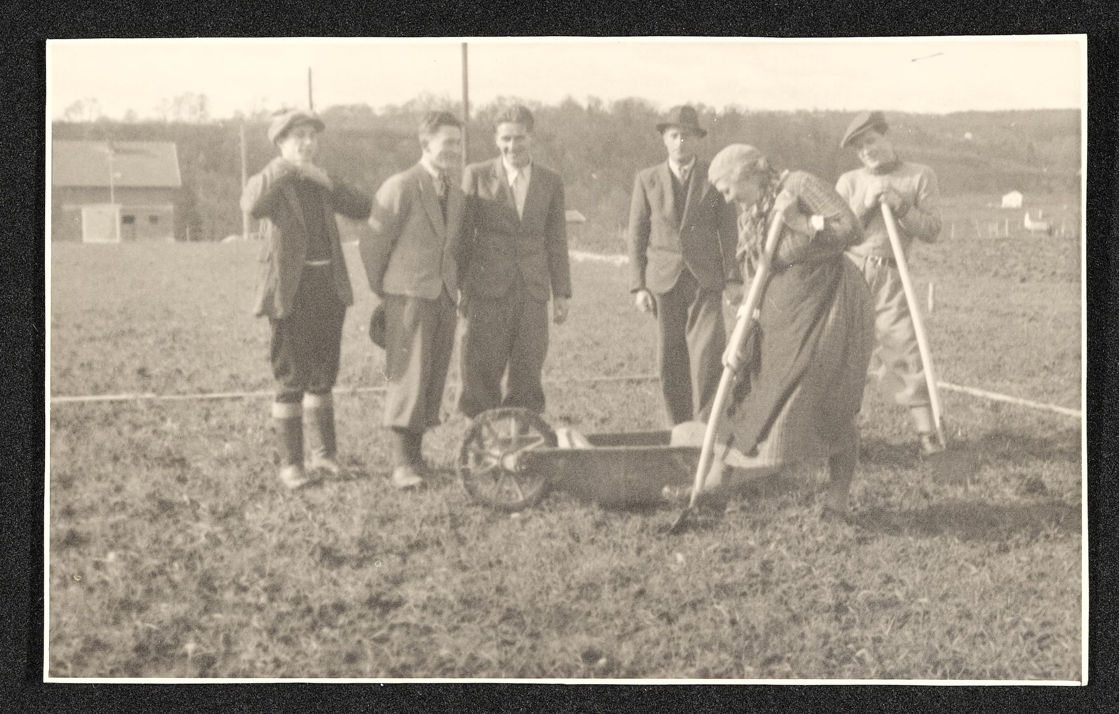 | Beschreibung | Frau Hübsch mit fünf Söhnen beim Spatenstich in der Gründbergsiedlung |