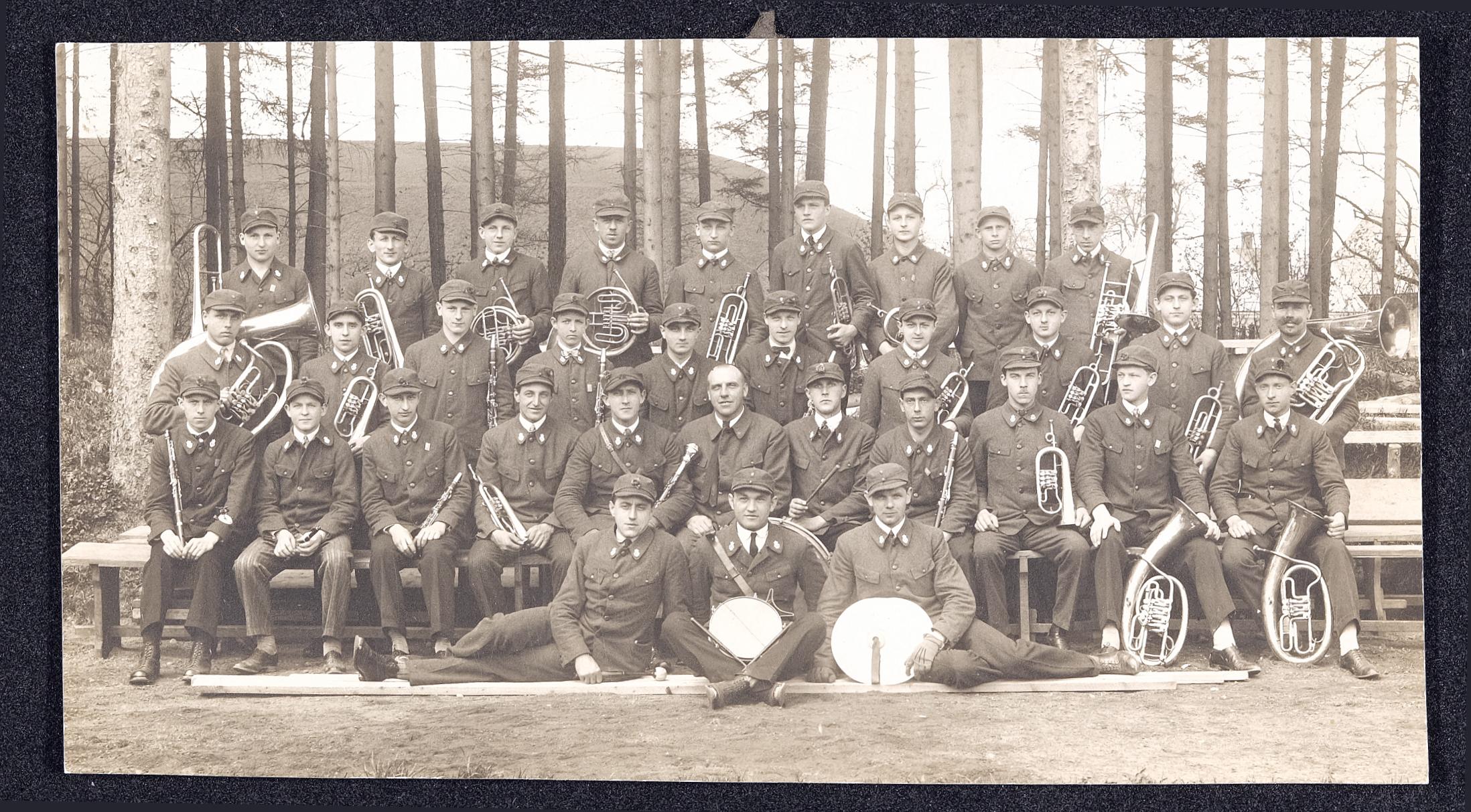 | Beschreibung | Gruppenfoto einer Musikkapelle; Herr Hübsch als Tambourmajor |
