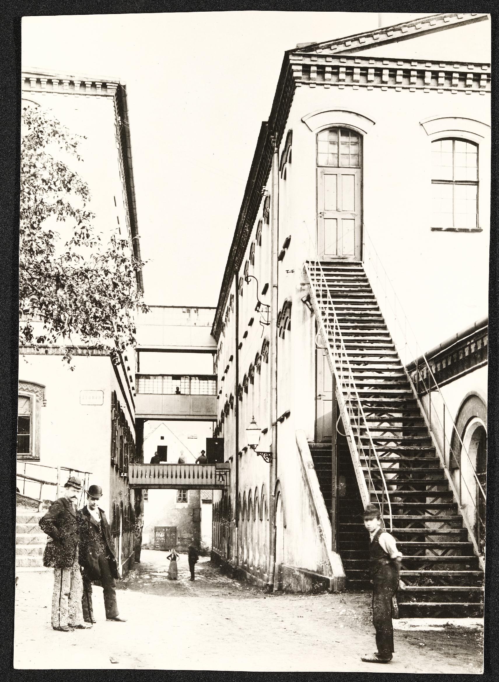 | Beschreibung | Drei Arbeiter vor dem Objekt II der Waffenfabrik im Wehrgraben, im Hintergrund Arbeiterin und Arbeiter im Gespräch |
