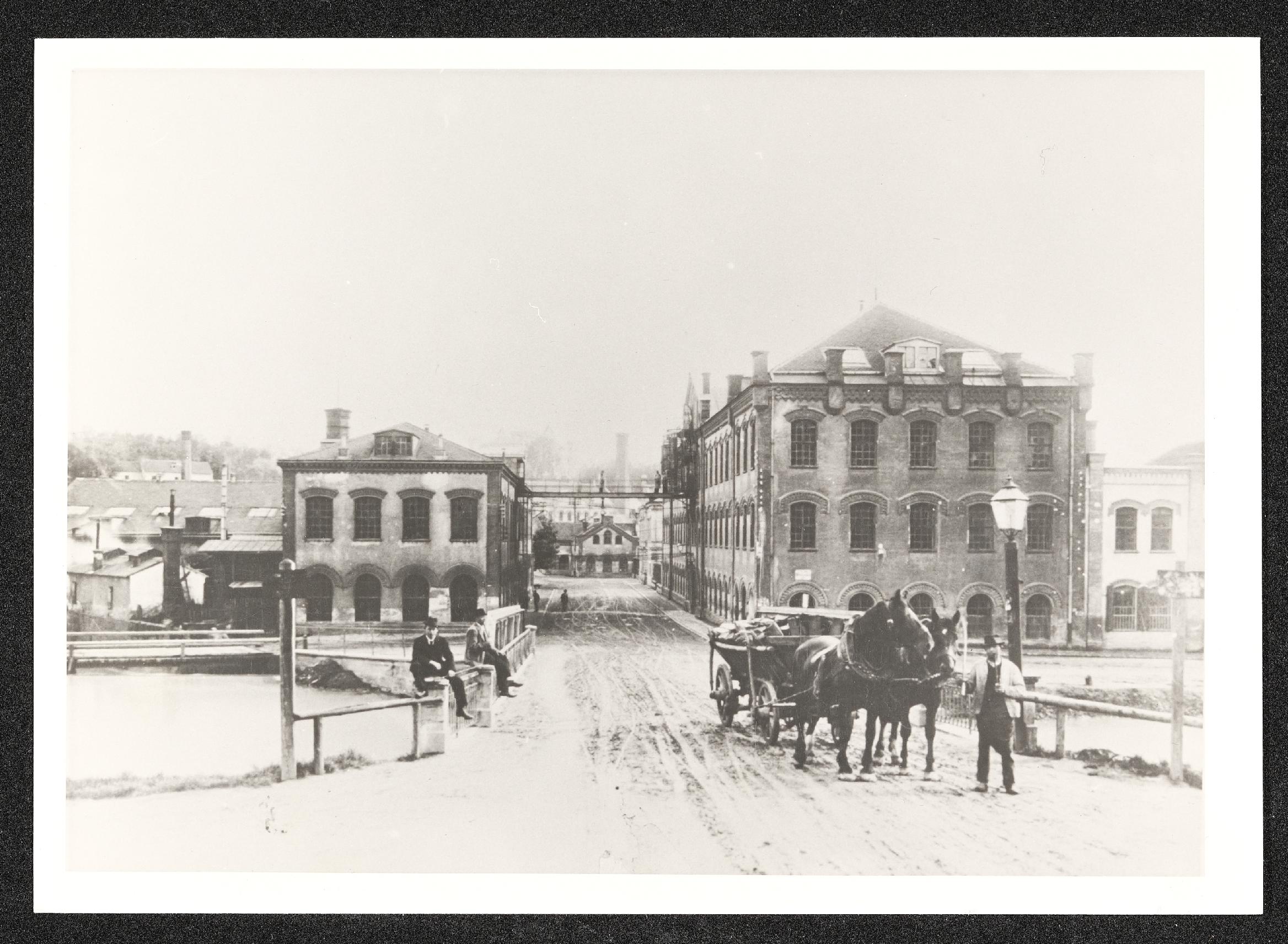 | Beschreibung | Waffenfabrik beim Kohlanger im Wehrgraben, Fuhrmann mit Pferdefuhrwerk verlässt die Fabrik, zwei Arbeiter sitzen am Brückengeländer |