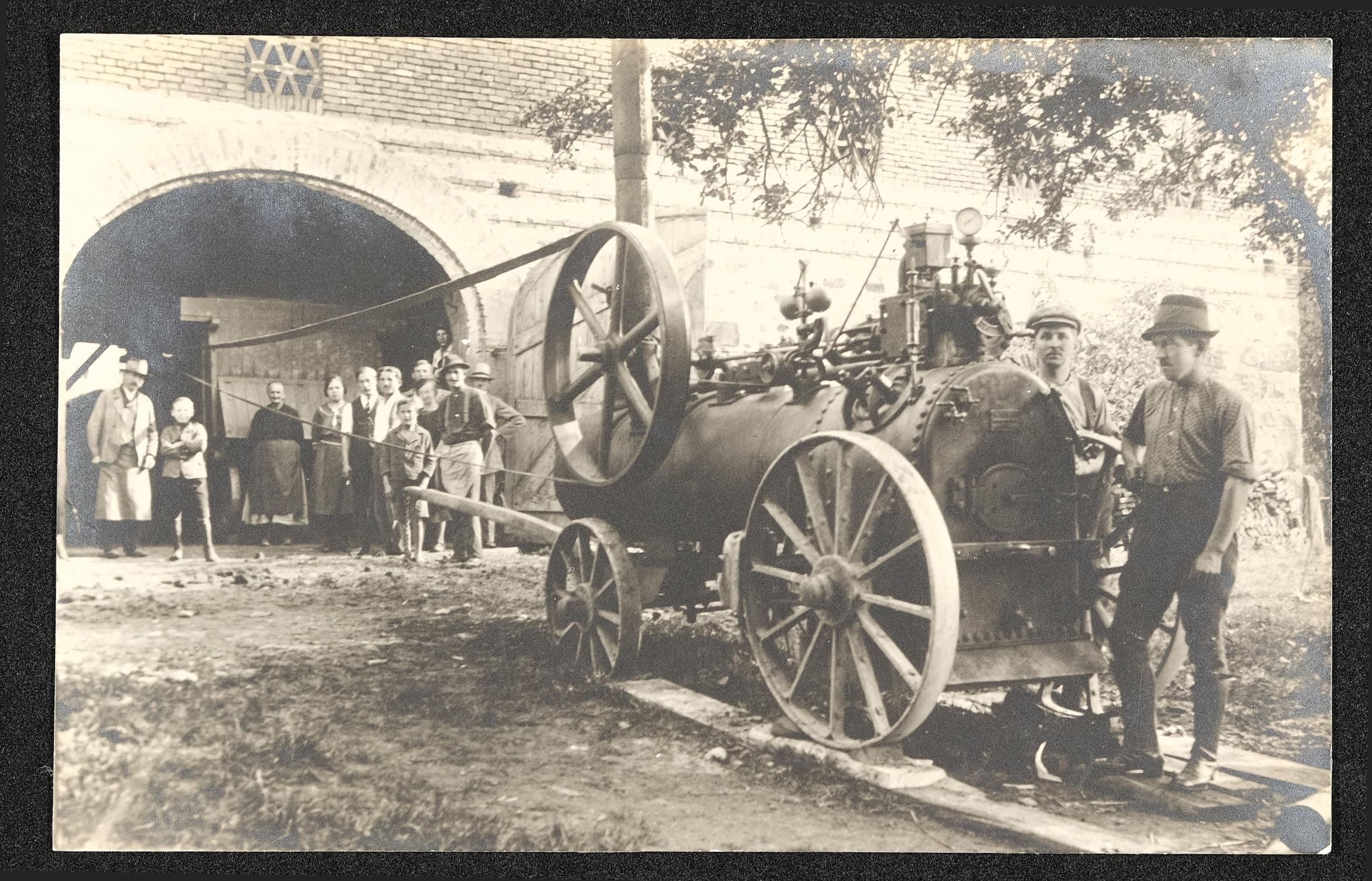 | Beschreibung | Dreschen mit einer neuen Dampfmaschine auf dem Bauernhof Sepplhut in Steyr, Damberggasse; Bauernfamilie, Kinder und Gesinde bestaunen die neue Maschine |