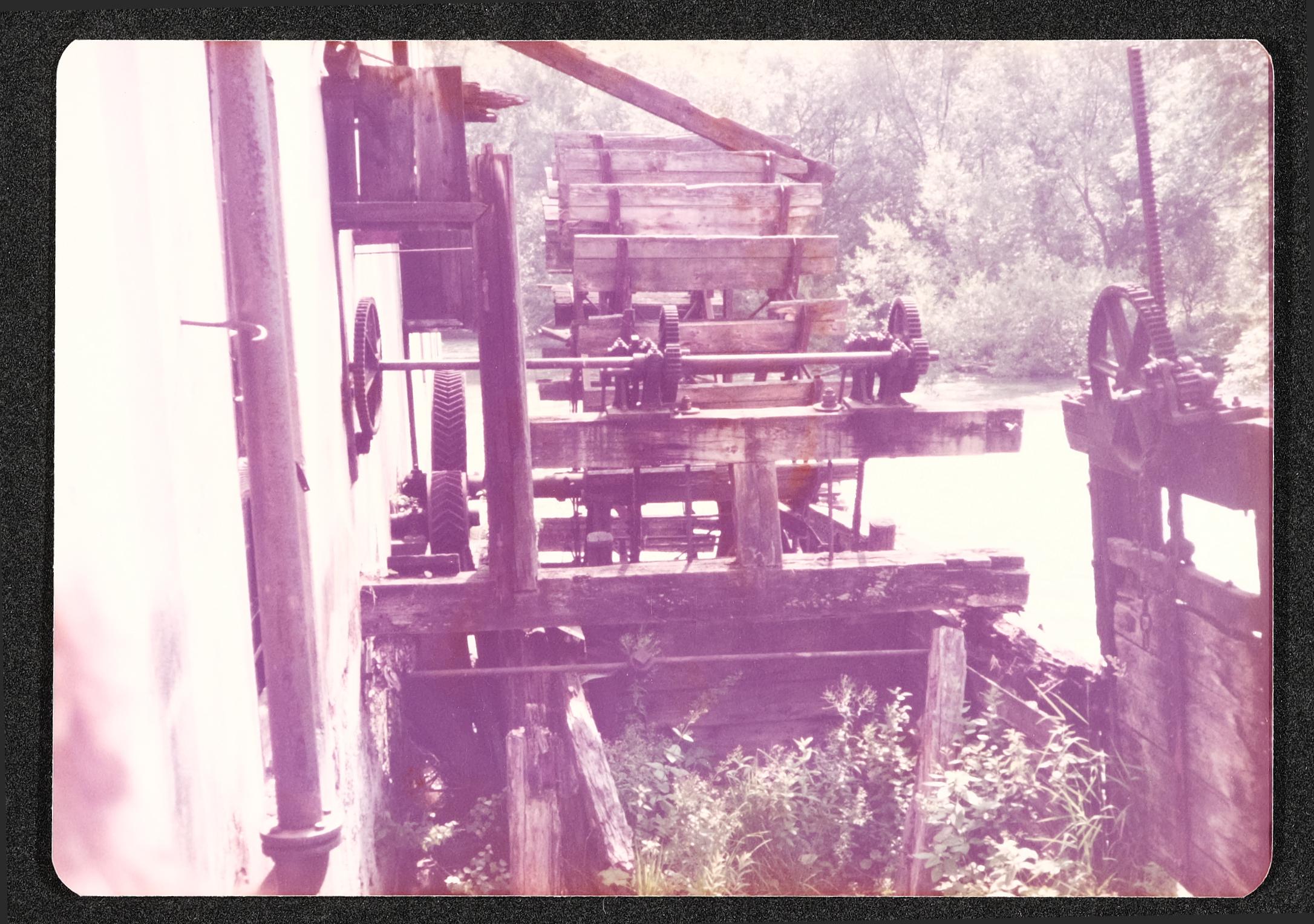 | Beschreibung | Außenansicht der Werndl'schen Nagelfabrik im Bauzustand von 1981, hölzernes Wasserrad am Kanal mit Kraftübersetzung als Antrieb |