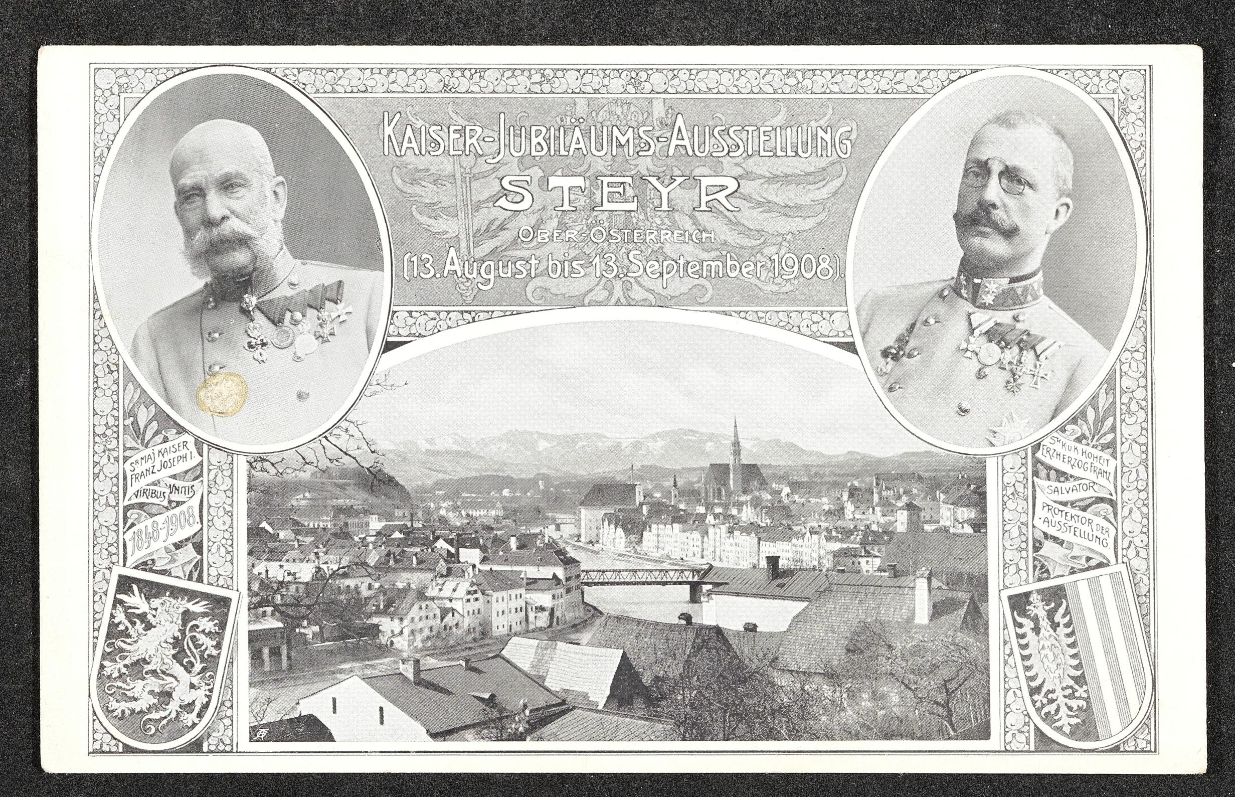 | Beschreibung | Ansichtskarte mit Fotos von Steyr, Kaiser Franz Joseph I. und Erzherzog Franz (Protektor der Ausstellung in Steyr vom 13. August bis 13. September 1908 anlässlich des 60. Geburtstages von Kaiser Franz Joseph I. |