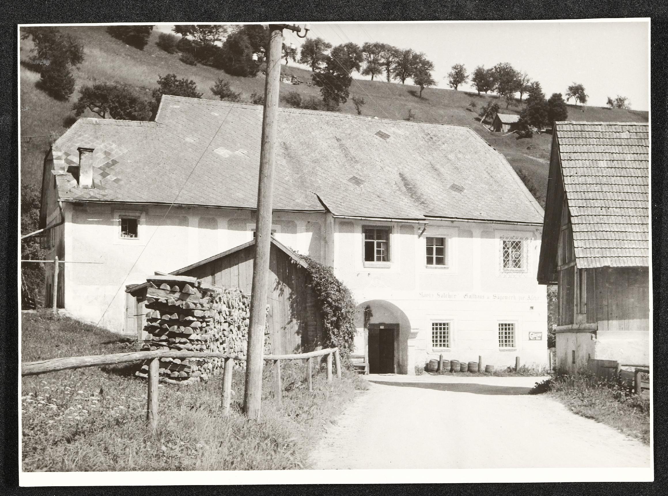 | Beschreibung | Maria Salcher's Gasthaus und Sägewerk zur Ascha in Großraming. Aufnahme der Straßenfront in Richtung Aschatal vom 1. Juni 1949. |