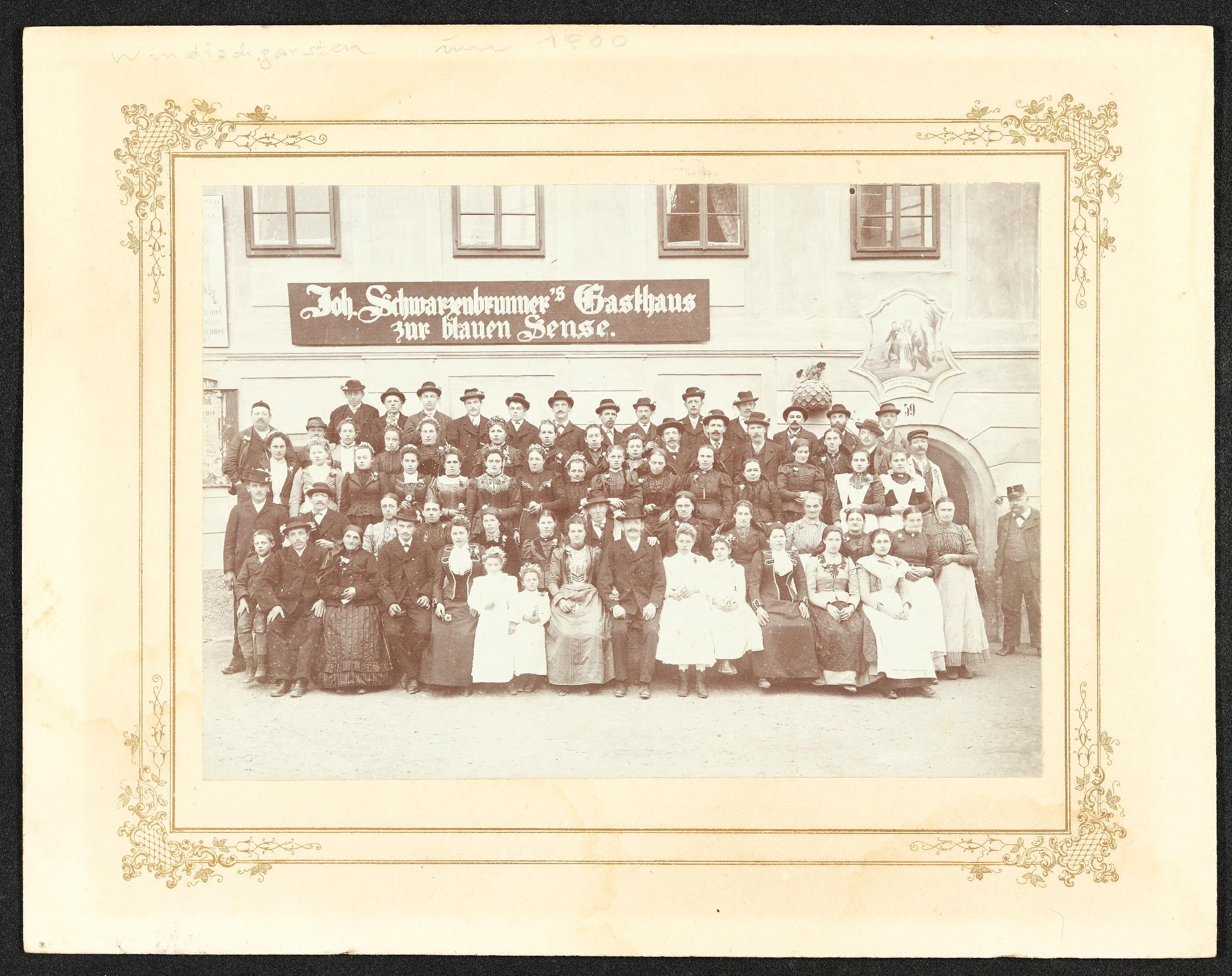 | Beschreibung | Bauernhochzeit um 1910 vor Johann Schwarzenbrunner's Gasthaus zur blauen Sense in Windischgarsten |