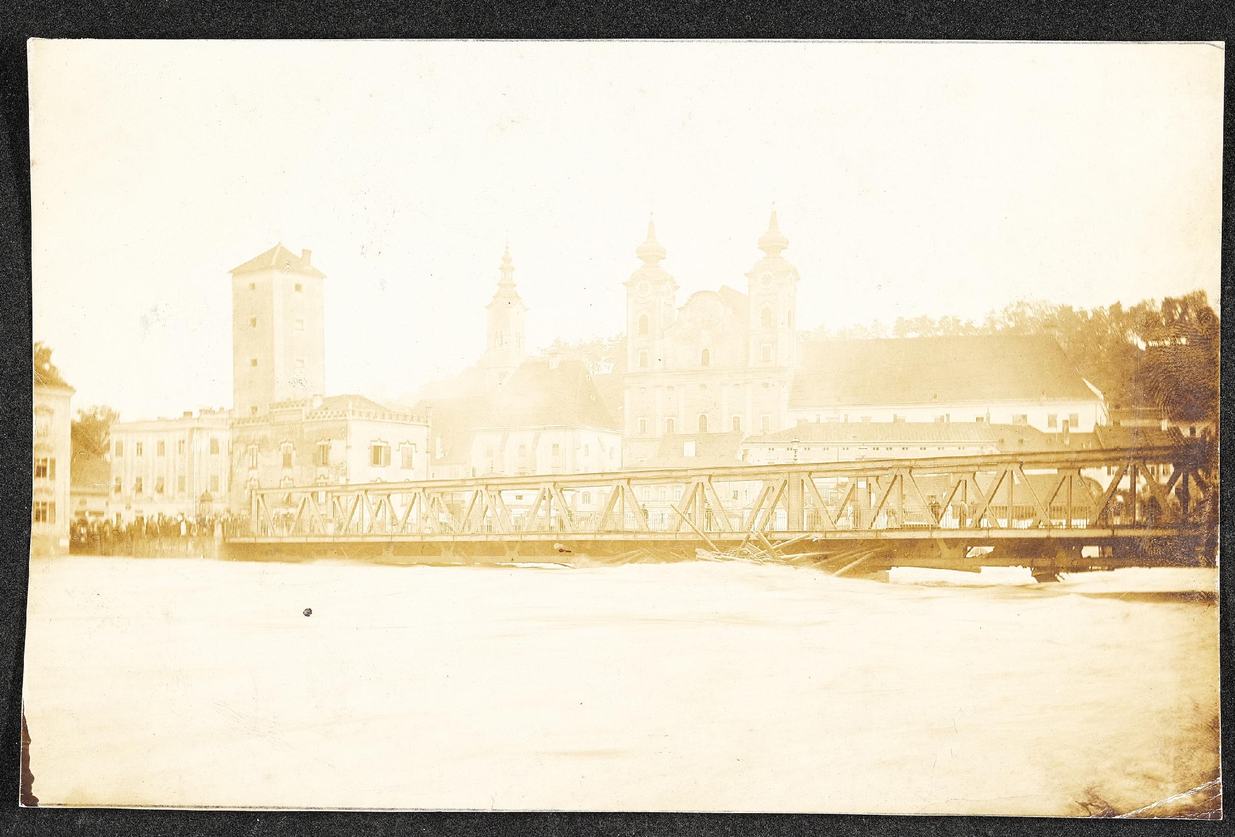 | Beschreibung | Blick von der Kollergasse auf die Ennsbrücke, das Bürgerspital und die Michaelerkirche während des Hochwassers in Steyr am 30. Juli 1897 |