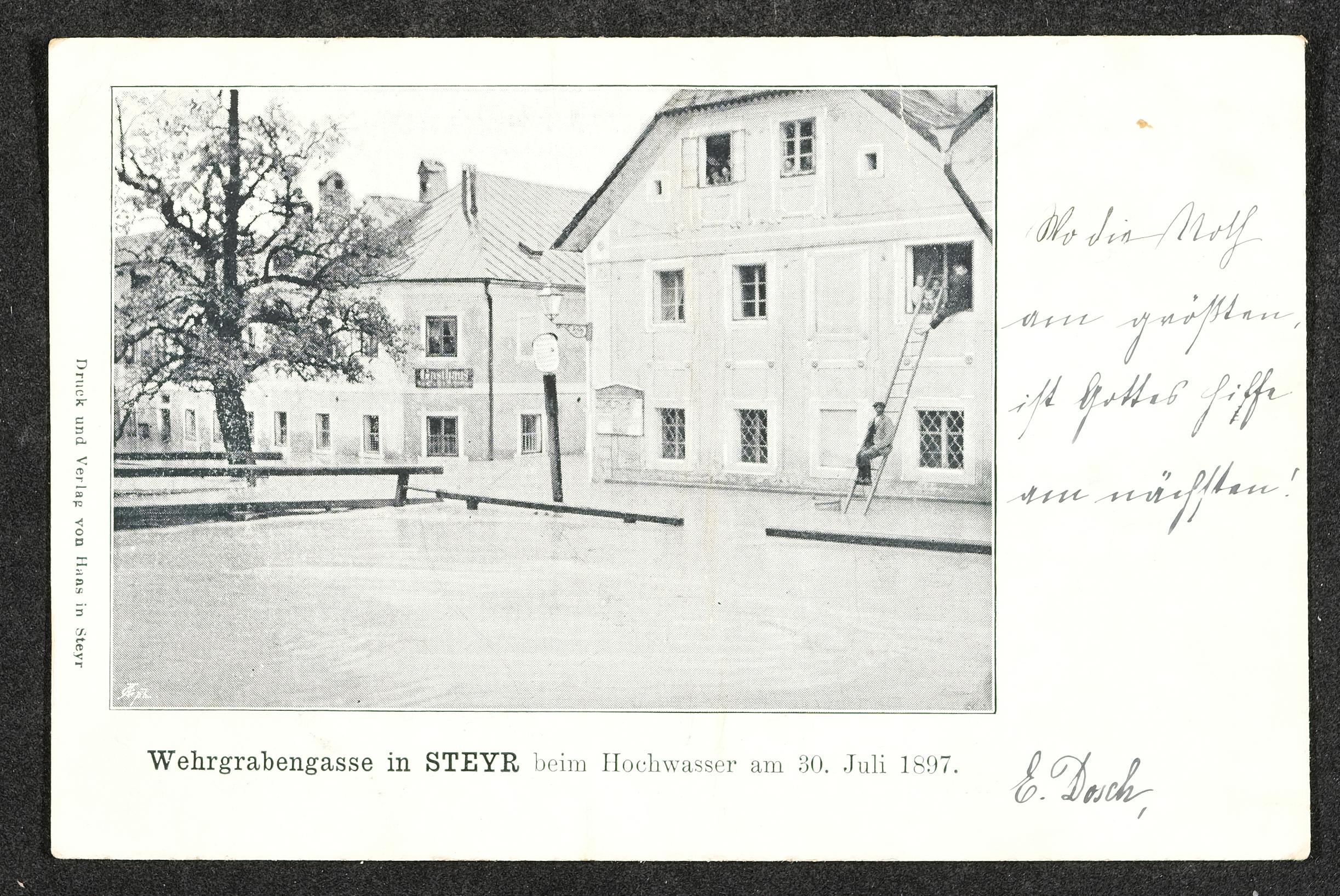 | Beschreibung | Korrespondenzkarte mit Ansicht des Hochwassers vom 30. Juli 1897 in der Wehrgrabengasse in Steyr |