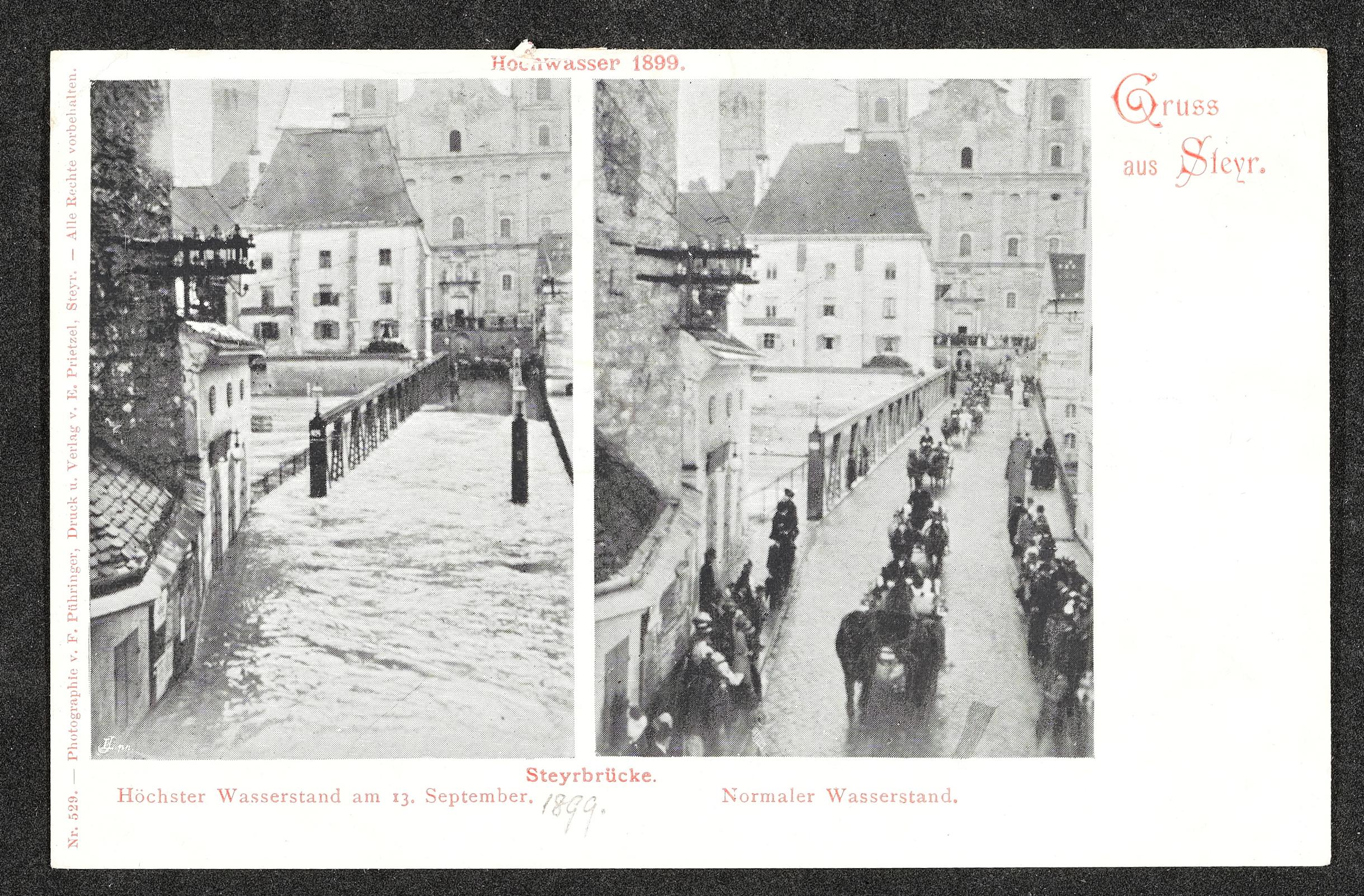 | Beschreibung | Hochwasser am 13. und 14. September 1899 in Steyr. Zwei Fotos zeigen den Unterschied zwischen höchstem (am 13. bzw. 14. September 1899) und normalem Wasserstand bei der Steyrbrücke. |