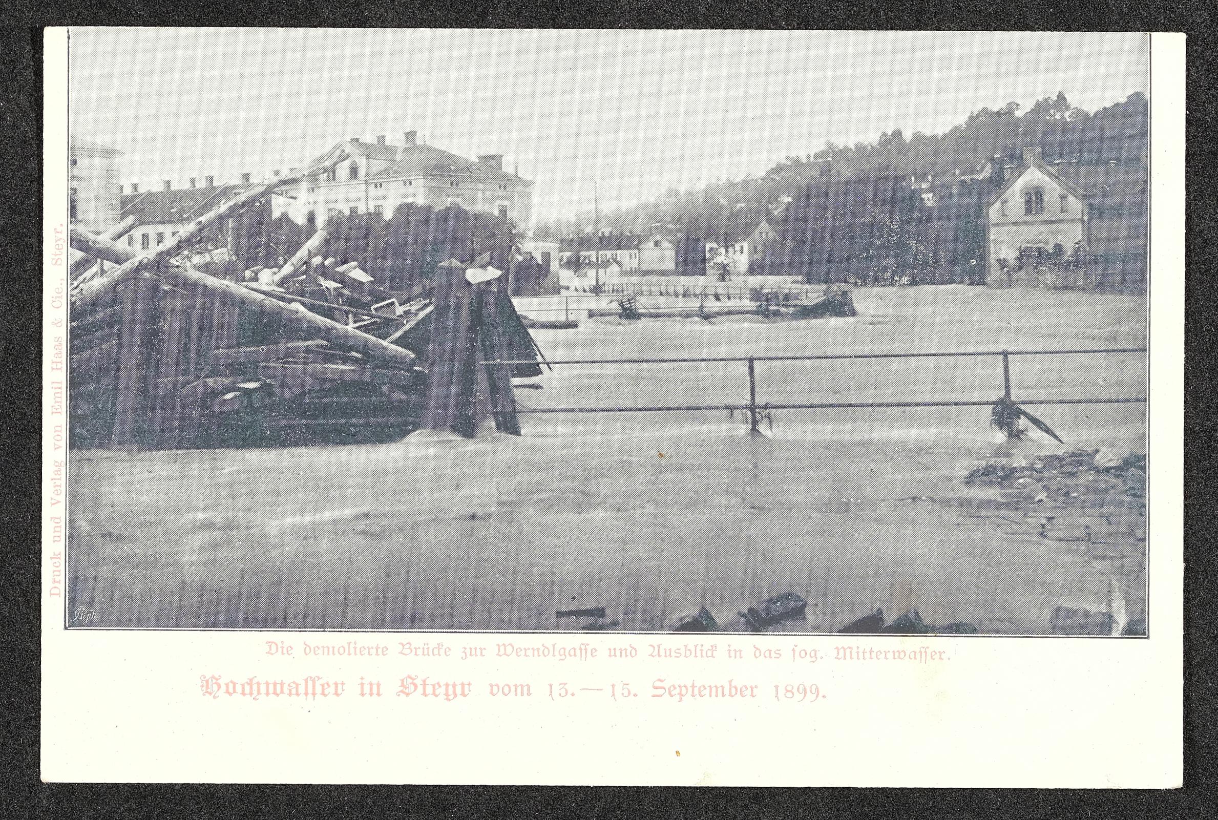| Beschreibung | Hochwasser am 13. und 14. September 1899 in Steyr, demolierte Brücke zur Werndlgasse und Blick zum Mitterwasser |