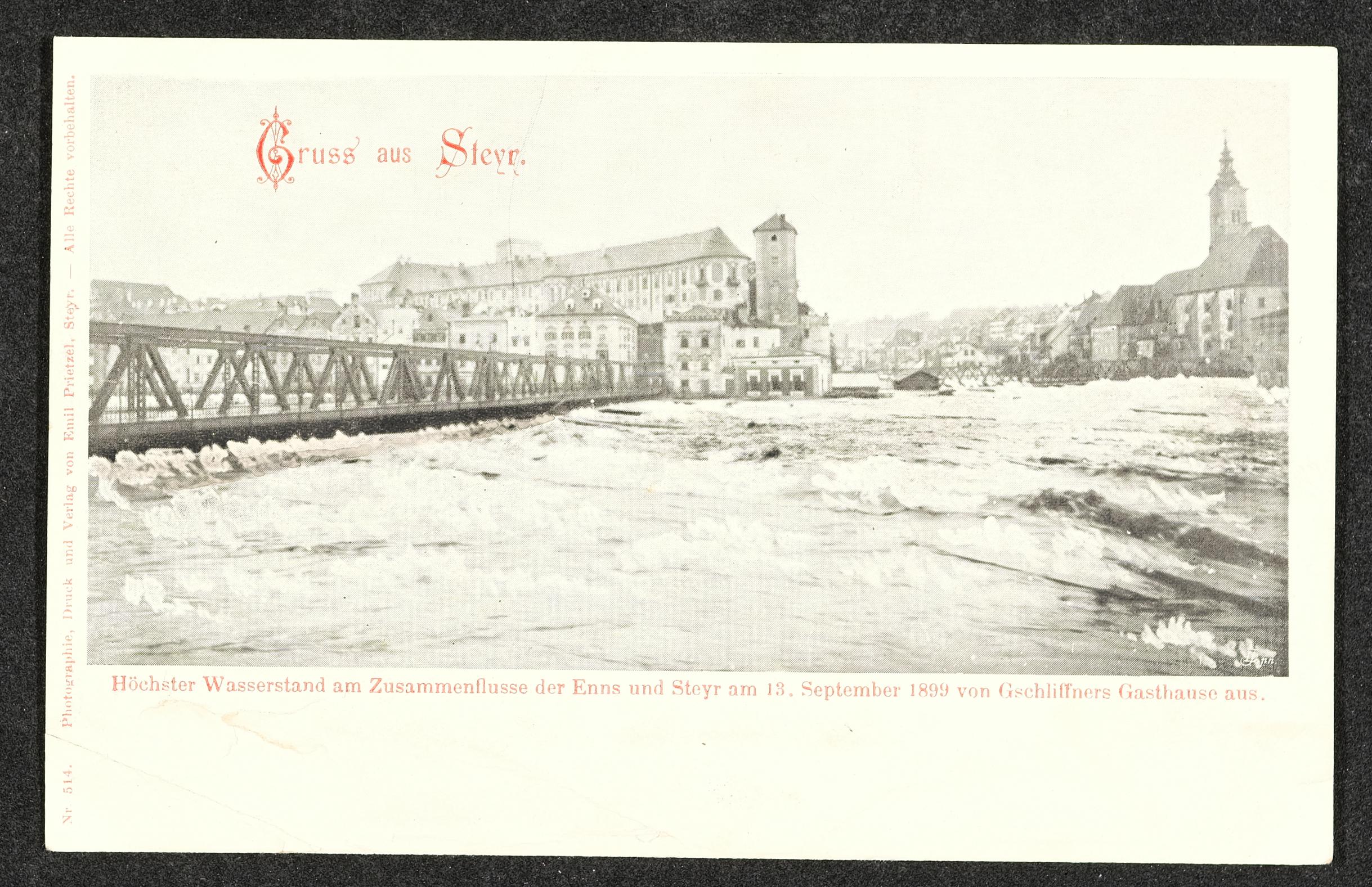 | Beschreibung | Hochwasser am 13. und 14. September 1899 in Steyr. Höchster Wasserstand am 14. September 1899 beim Zusammenfluss von Enns und Steyr. Bildmitte: Schloss Lamberg, rechter Bildrand: Bürgerspital |