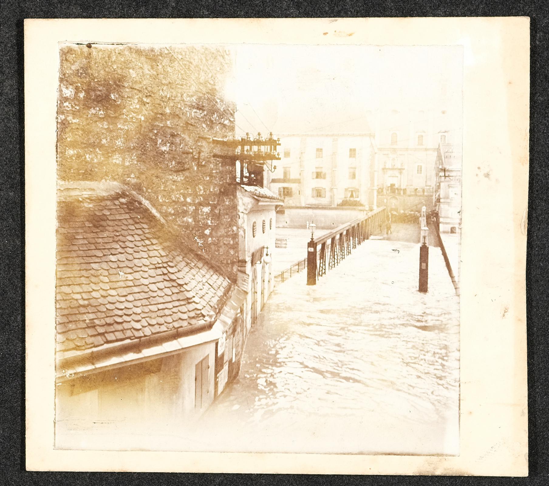 | Beschreibung | Hochwasser am 13. und 14. September 1899 in Steyr, Blick von den Häusern bei Zwischenbrücken (entlang der Schlossmauer unterhalb Schloss Lamberg) auf die überschwemmte Steyr-Brücke Richtung Bürgerspital und Michaelerkirche |
