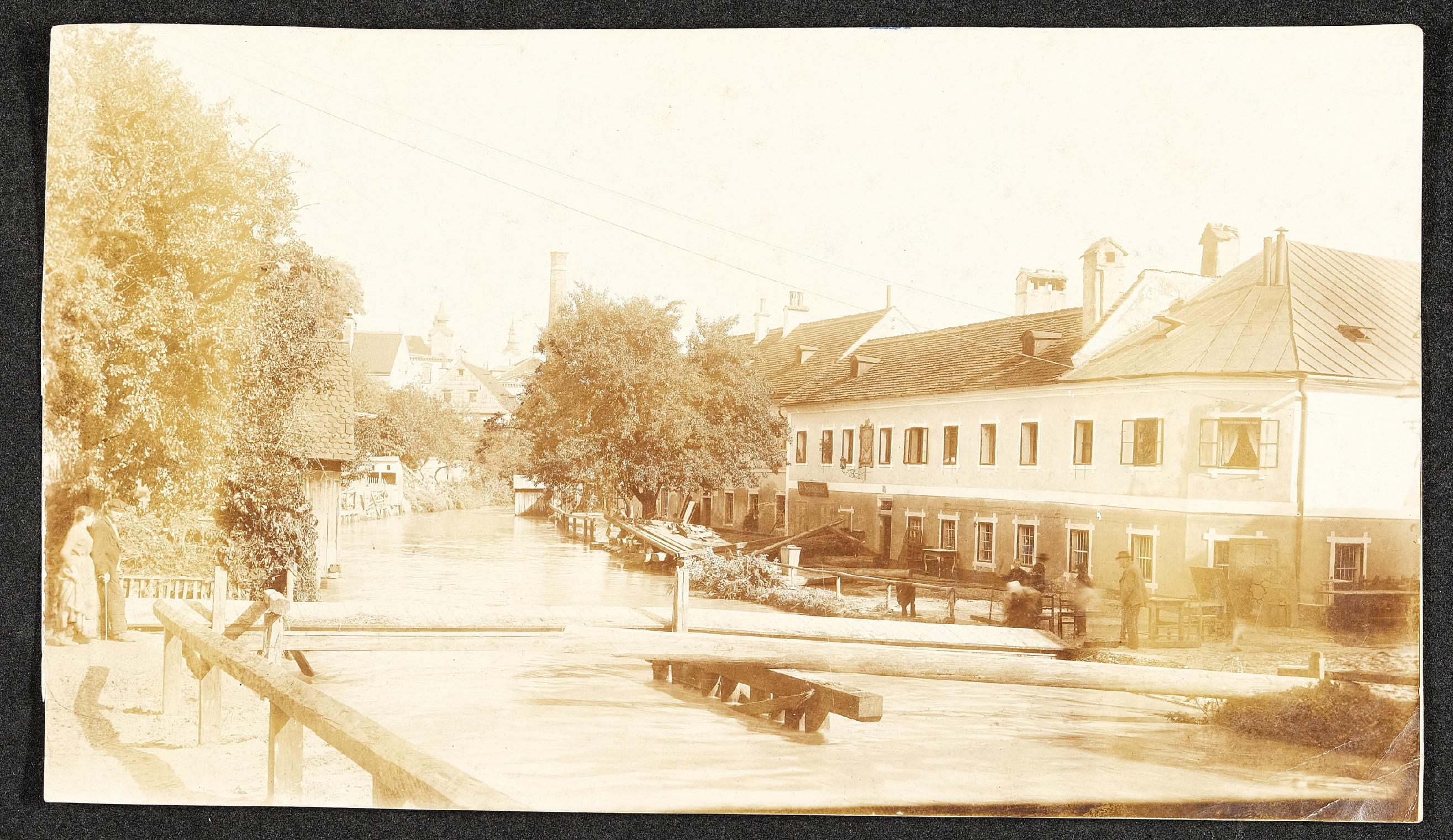 | Beschreibung | Hochwasser am 13. und 14. September 1899 in Steyr. Im Haus Wehrgraben Gasse 29 (rechts im Bild) befindet sich zu dieser Zeit eine Textildruckfabrik. |