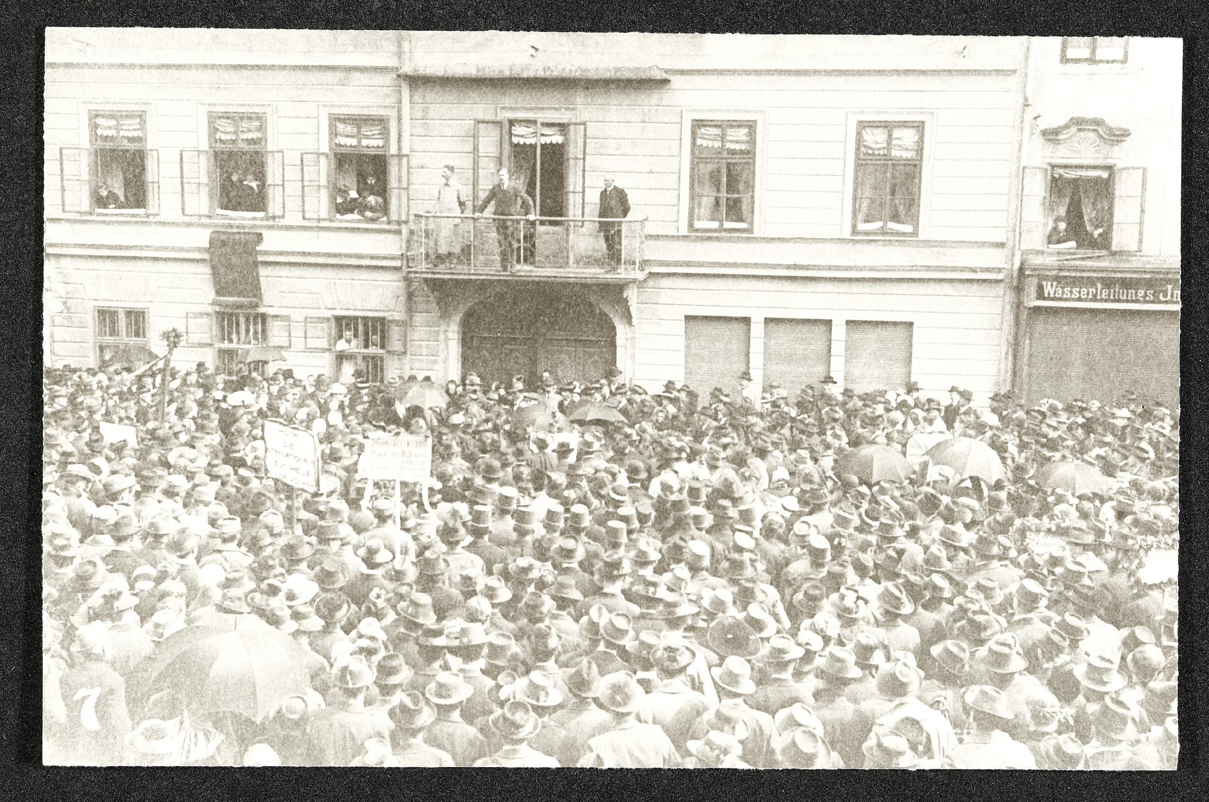 | Beschreibung | 1. Mai Feier in Oberösterreich, Redner am Balkon und unterhalb die Menschenmenge |