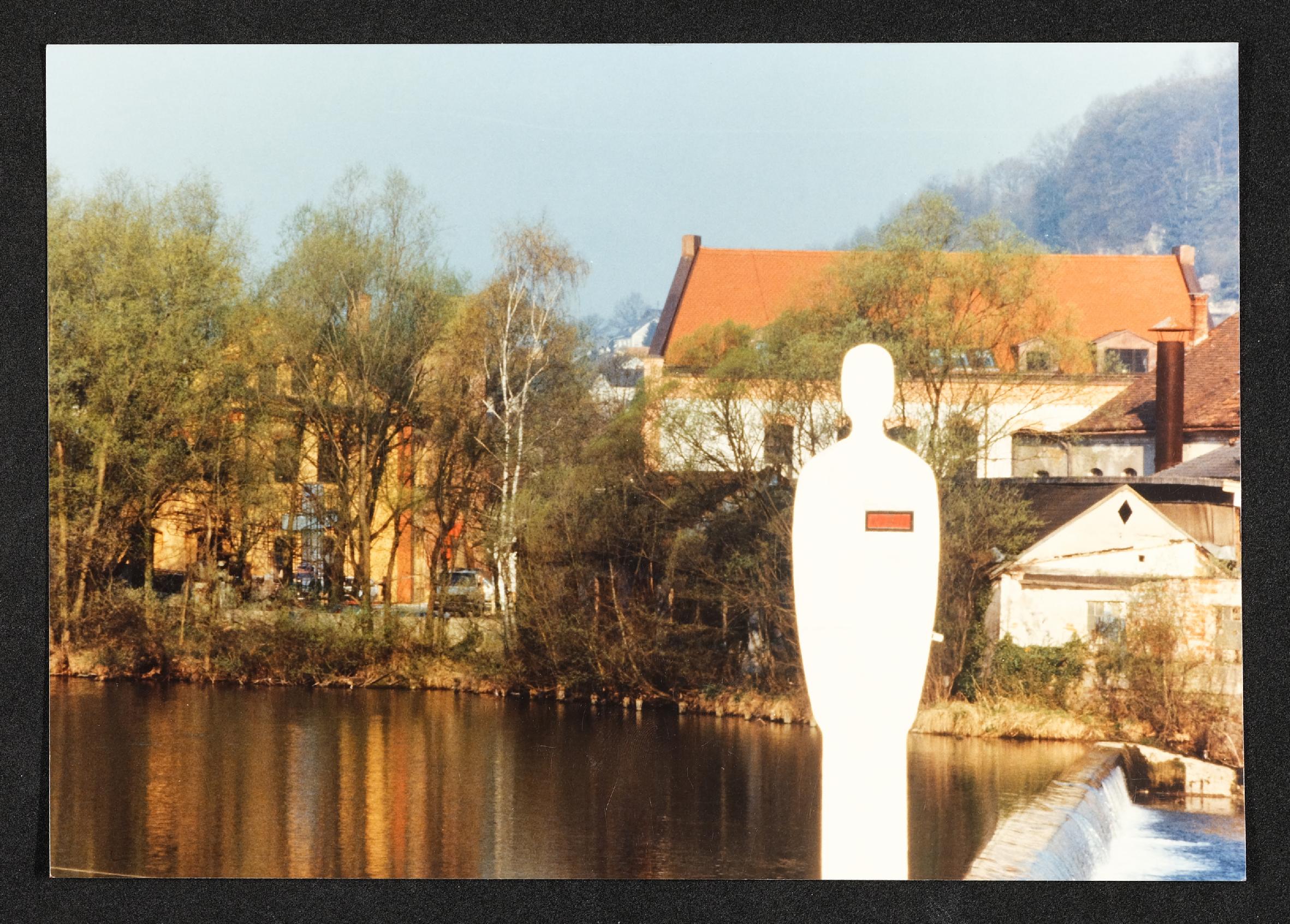| Titel | Museum Arbeitswelt - Statue in der Steyr - im Hintergrund Hack-Werke |
