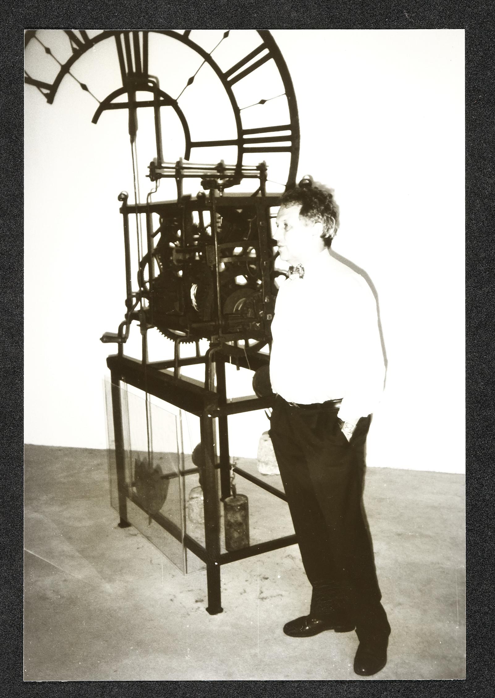 | Beschreibung | Uhrmachermeister Friedrich Schmollgruber vor einem seiner Uhren-Sammelobjekte |