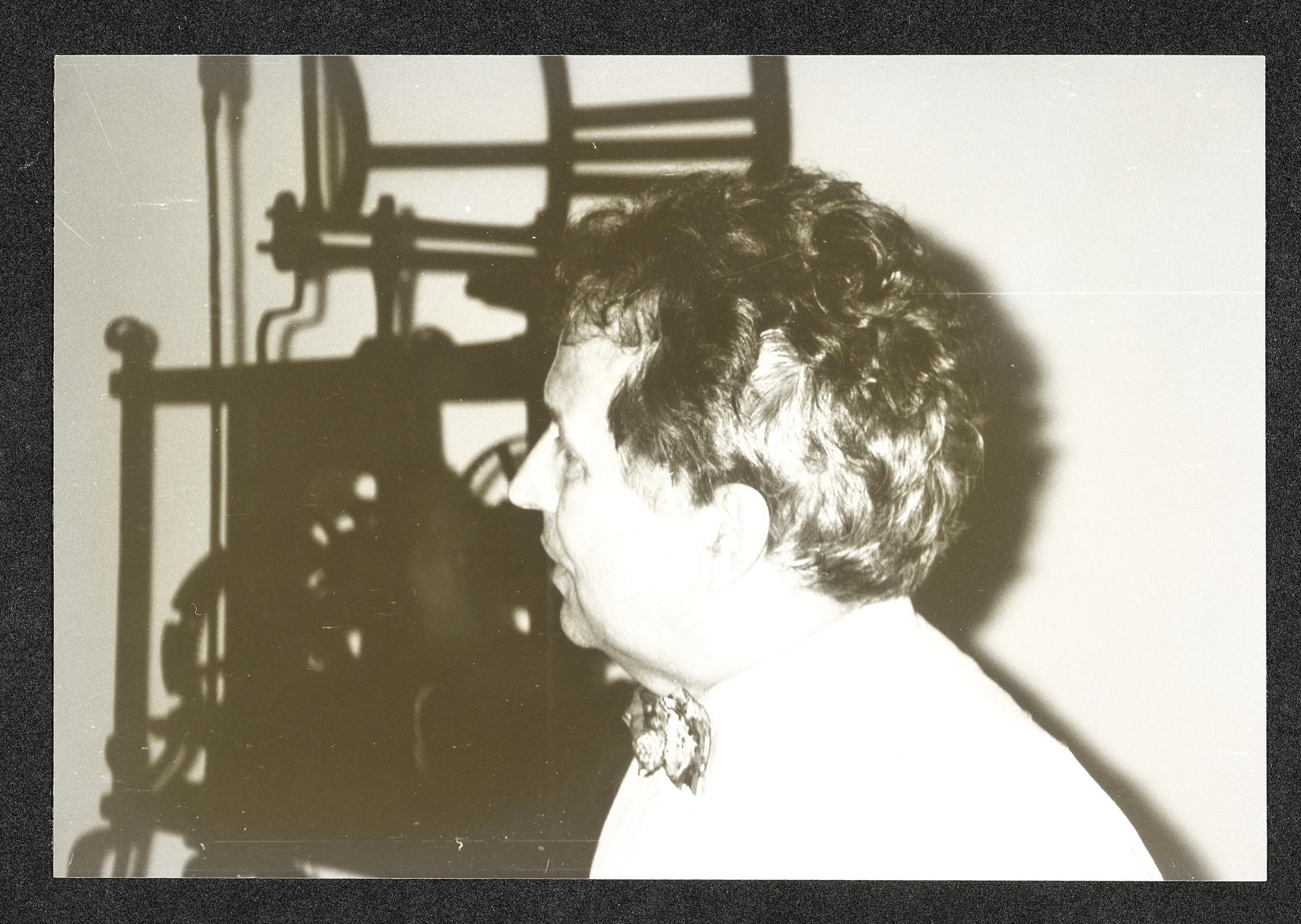 | Beschreibung | Uhrmachermeister Friedrich Schmollgruber vor einem seiner Uhren-Sammelobjekte |