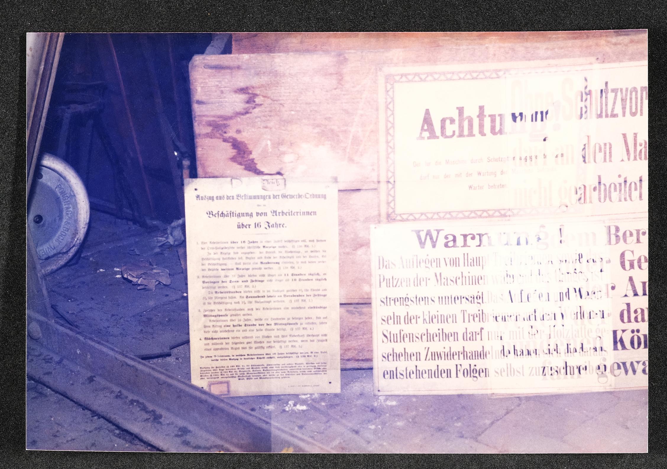 | Beschreibung | Warnschilder über Arbeit an Maschinen und Auszug aus den Bestimmungen der Gewerbe-Ordnung über die Beschäftigung von Arbeiterinnen über 16 Jahre. Foto vom März 1986 aus einer Firma. Nähere Daten nicht bekannt. |