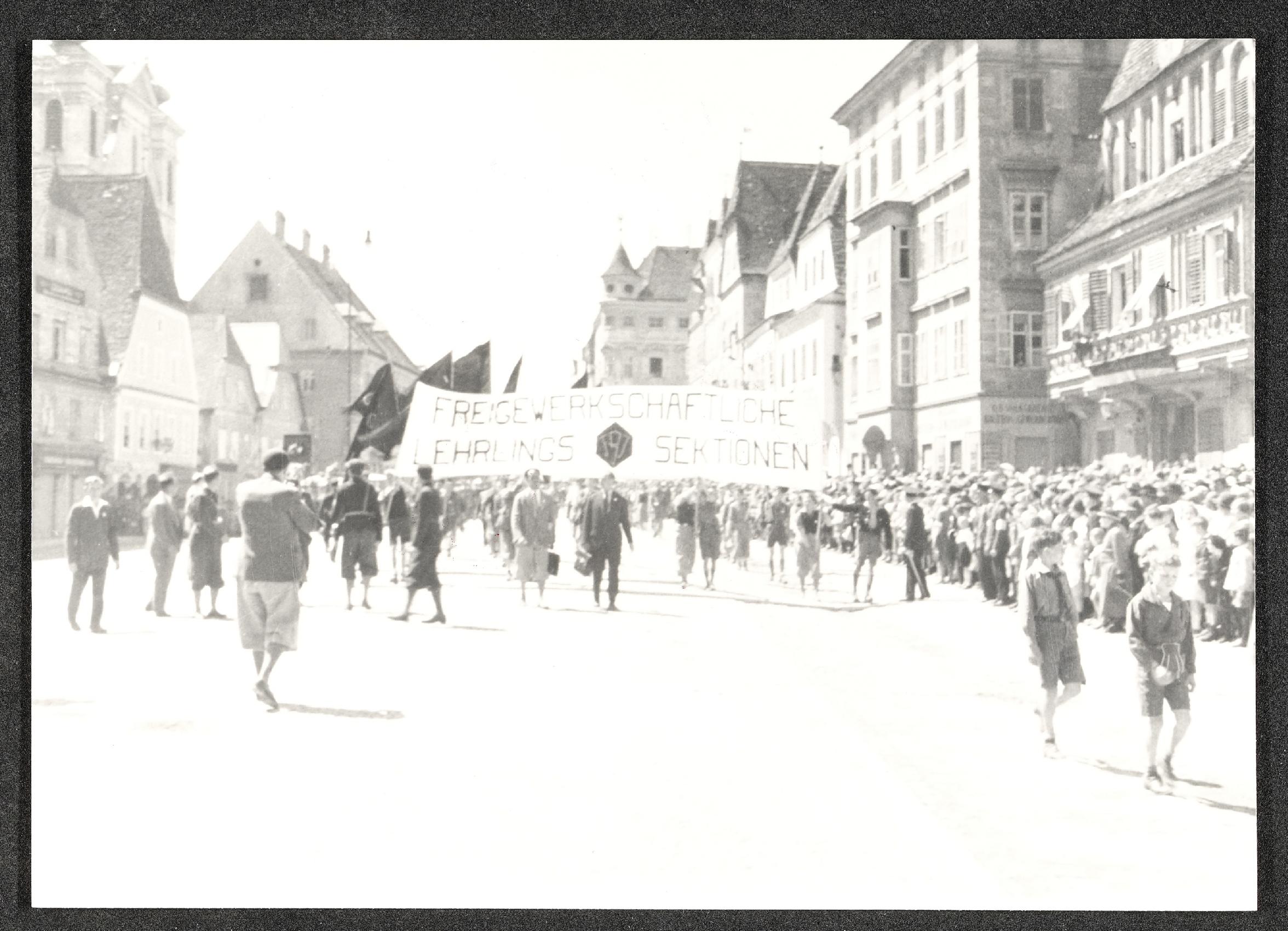 | Beschreibung | Steyr, Stadtplatz, Maiaufmarsch an einem 1. Mai, Transparent "Freigewerkschaftliche Lehrlingssektionen" |