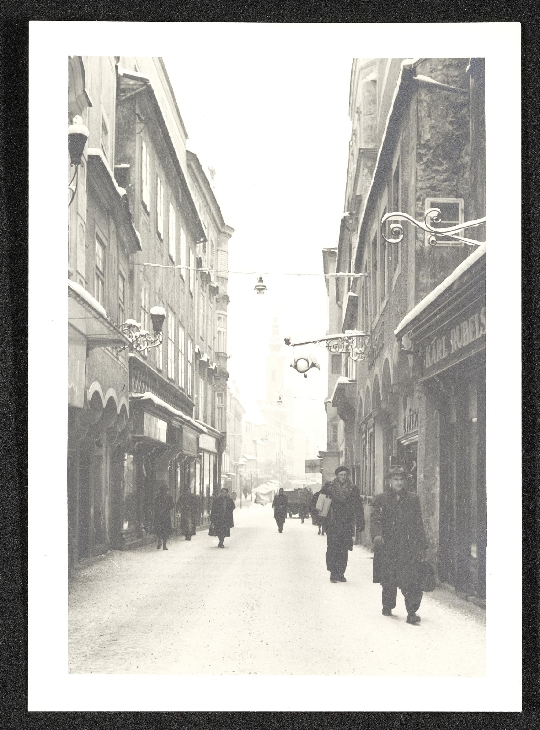 | Beschreibung | Blick von der Enge Gasse Richtung Rathaus in Steyr im Winter 1955 |