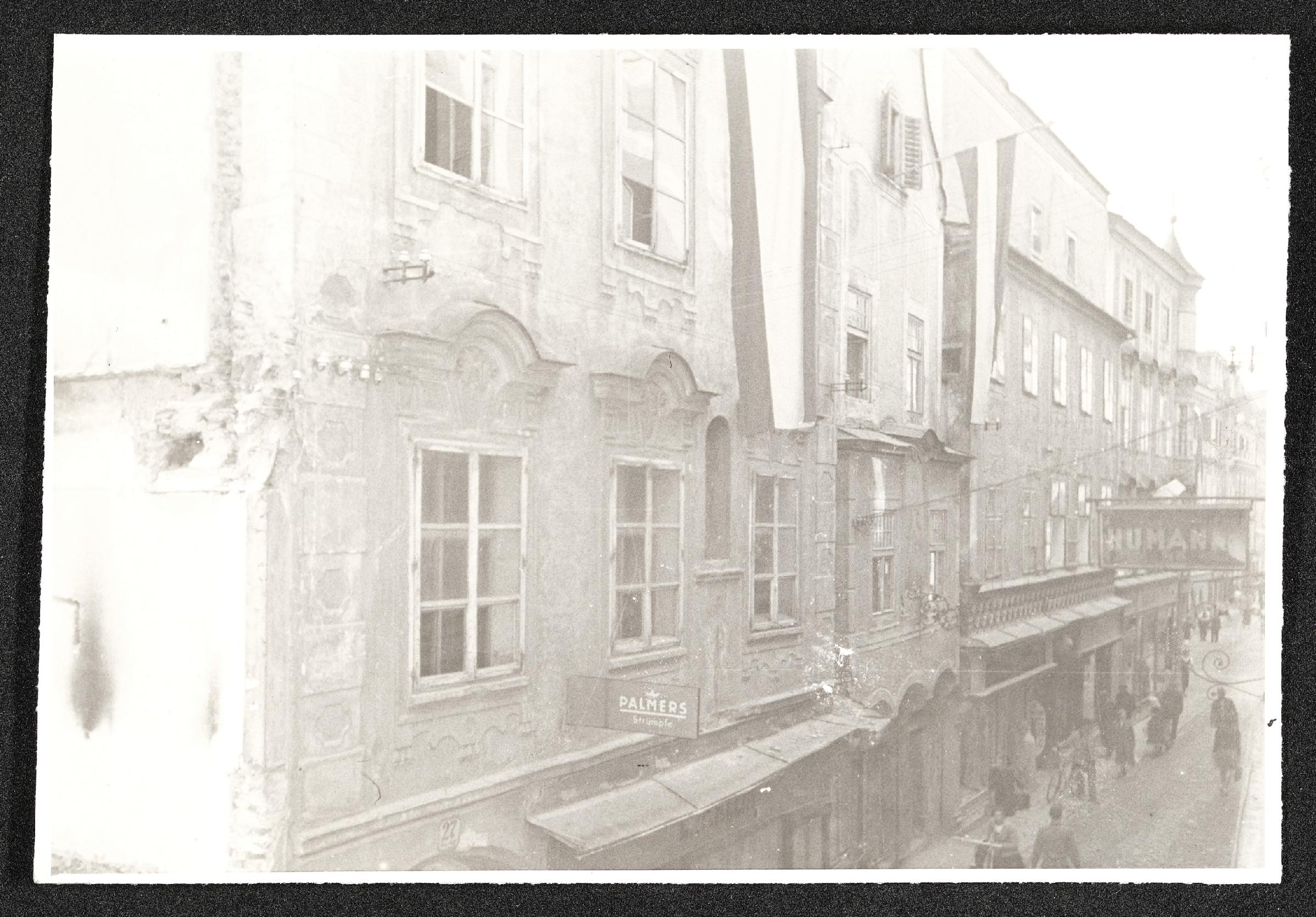 | Beschreibung | Blick aus der Enge Gasse Richtung Stadtplatz in Steyr (um 1950) |