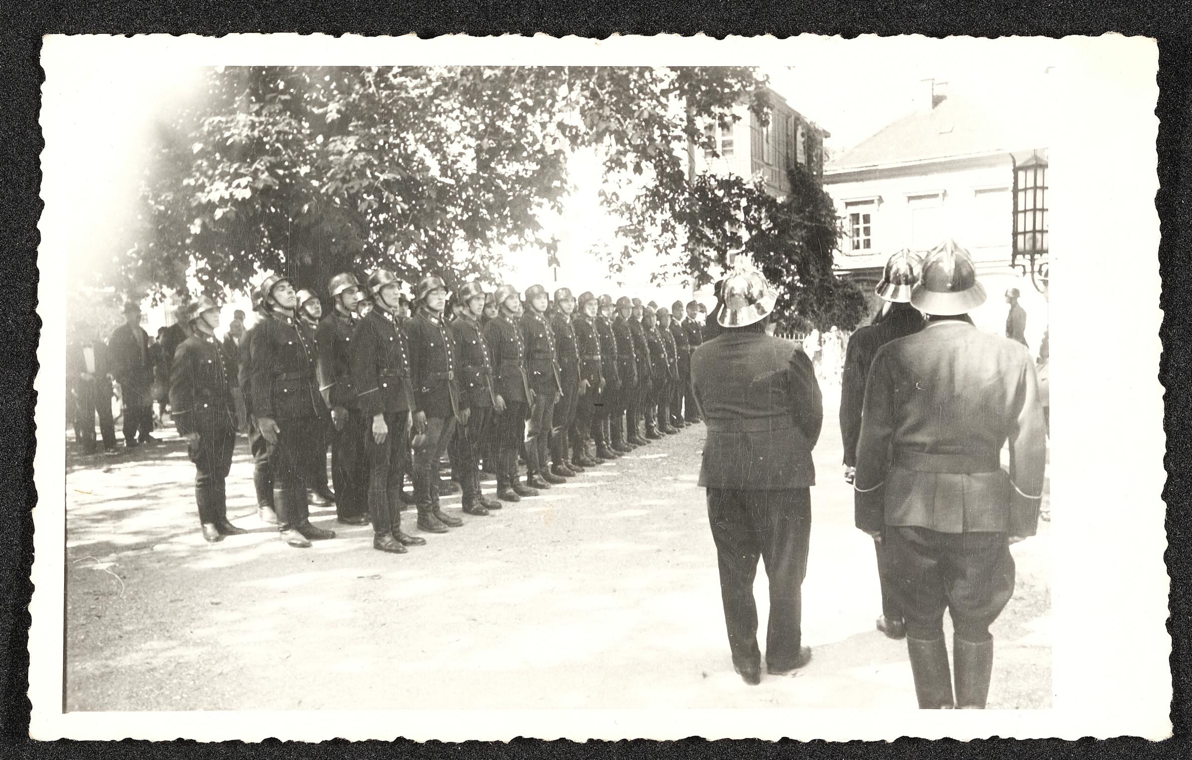| Beschreibung | Mannschaftsaufstellung für Feuerwehrübung am 7. August 1949, Brandannahme Gebäude am Stadtplatz 30 in Steyr brennt. |