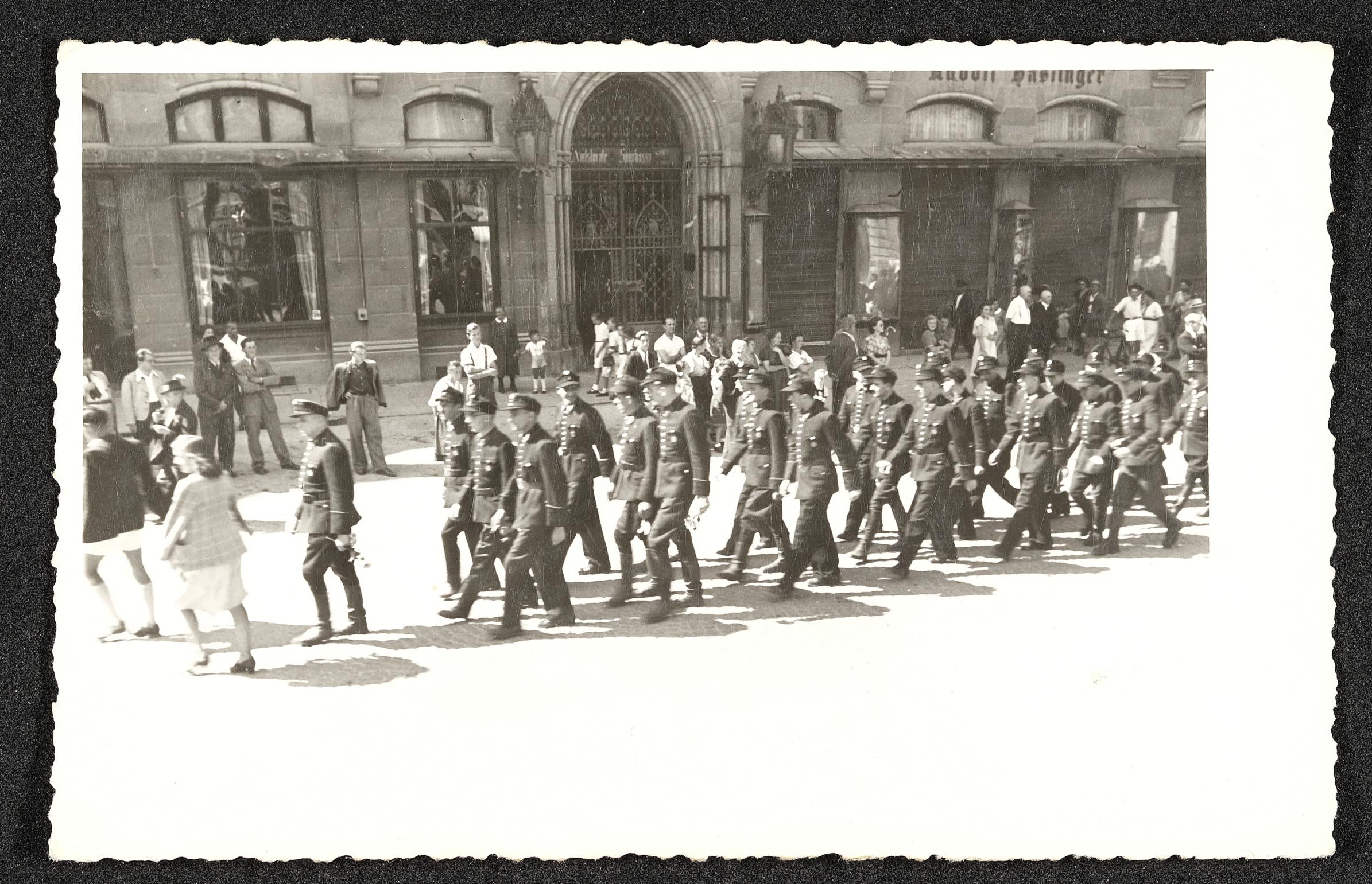 | Beschreibung | Mannschaft der Feuerwehrübung am 7. August 1949, Brandannahme Gebäude am Stadtplatz 30 in Steyr brennt. |