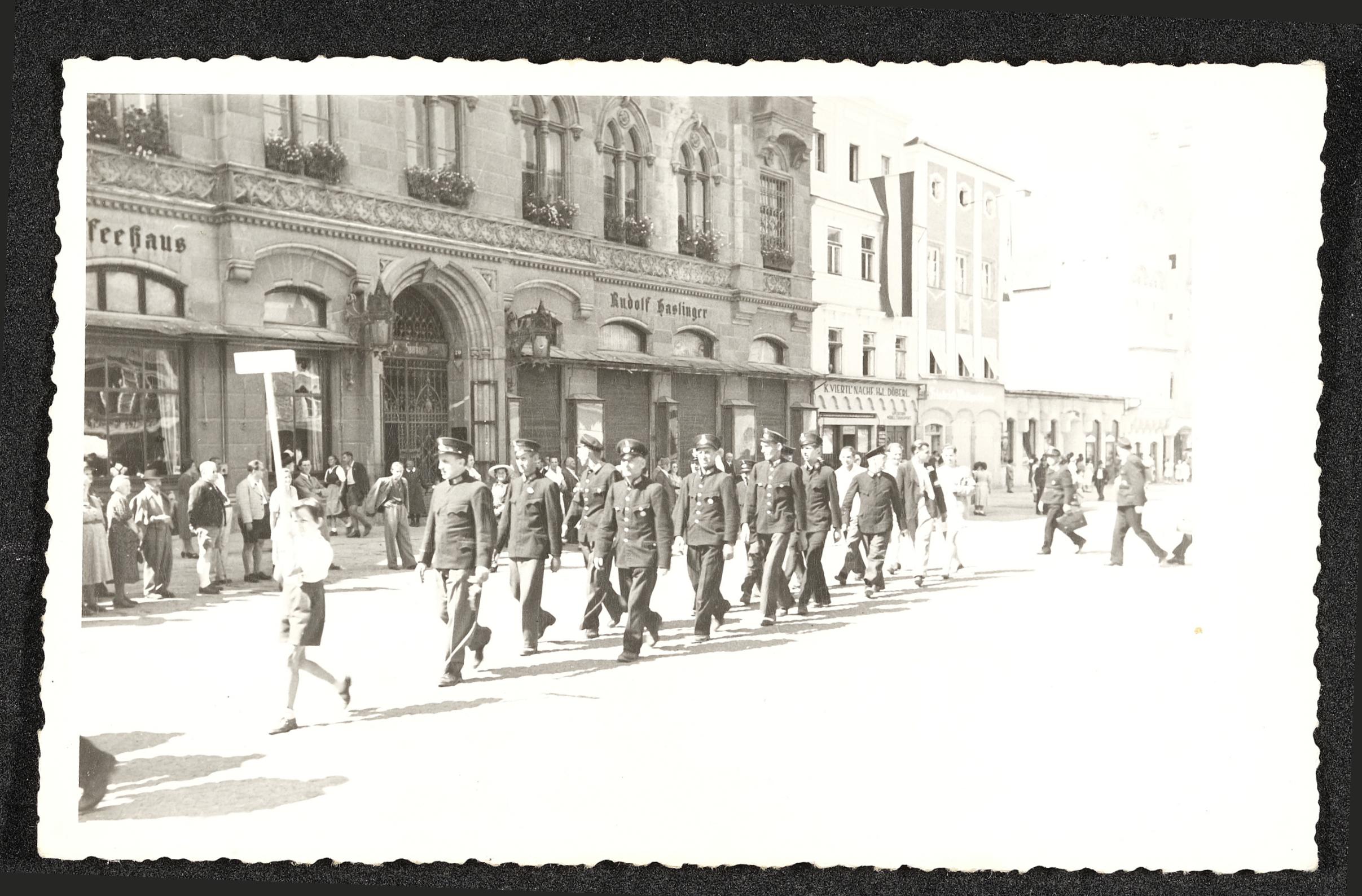 | Beschreibung | Mannschaft der Feuerwehrübung am 7. August 1949, Brandannahme Gebäude am Stadtplatz 30 in Steyr brennt. |