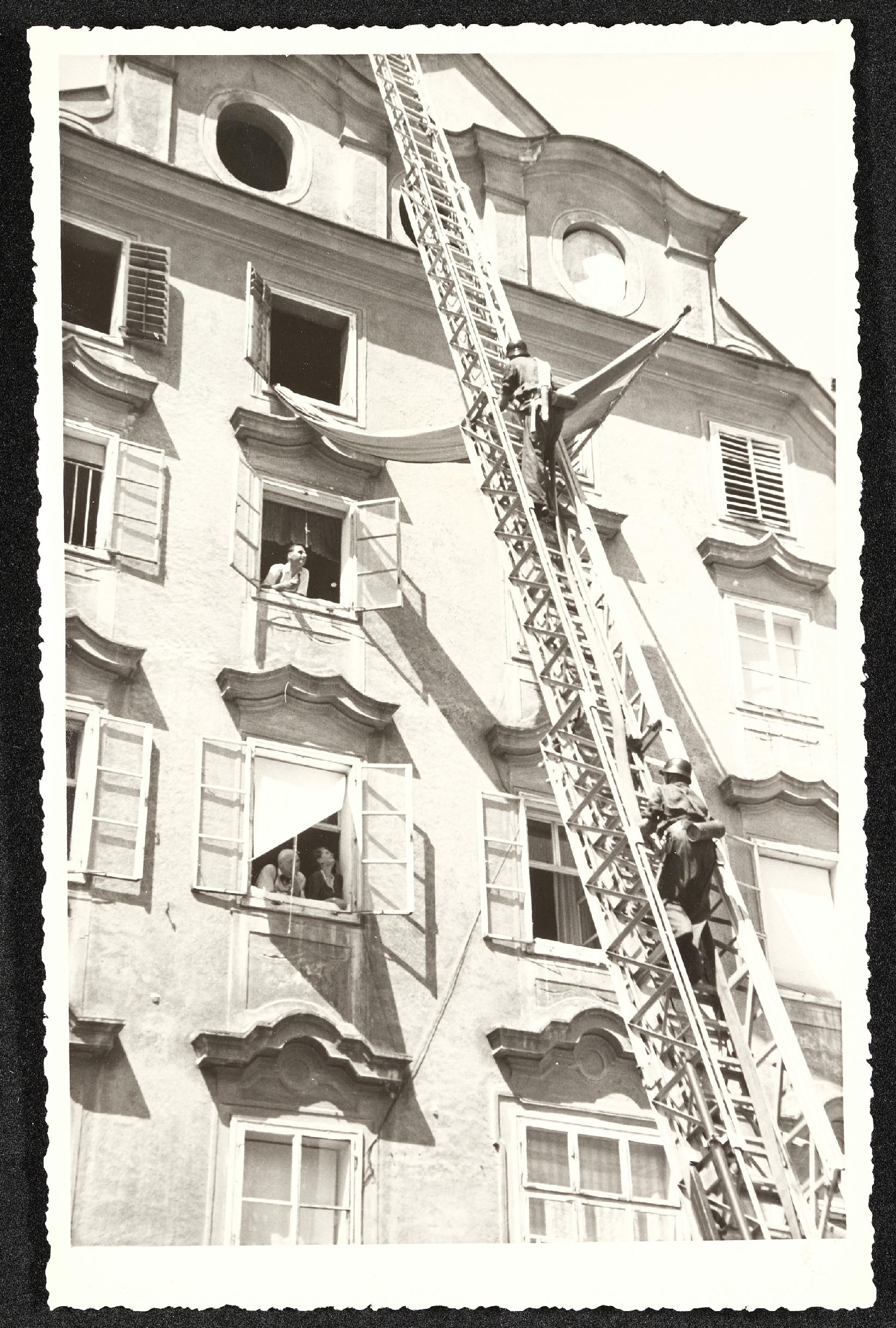 | Beschreibung | Mannschaft der Feuerwehrübung am 7. August 1949, Brandannahme Gebäude am Stadtplatz 30 in Steyr brennt. Eine Feuerwehrleiter steht hier beim Haus Stadtplatz 24 in Steyr. |