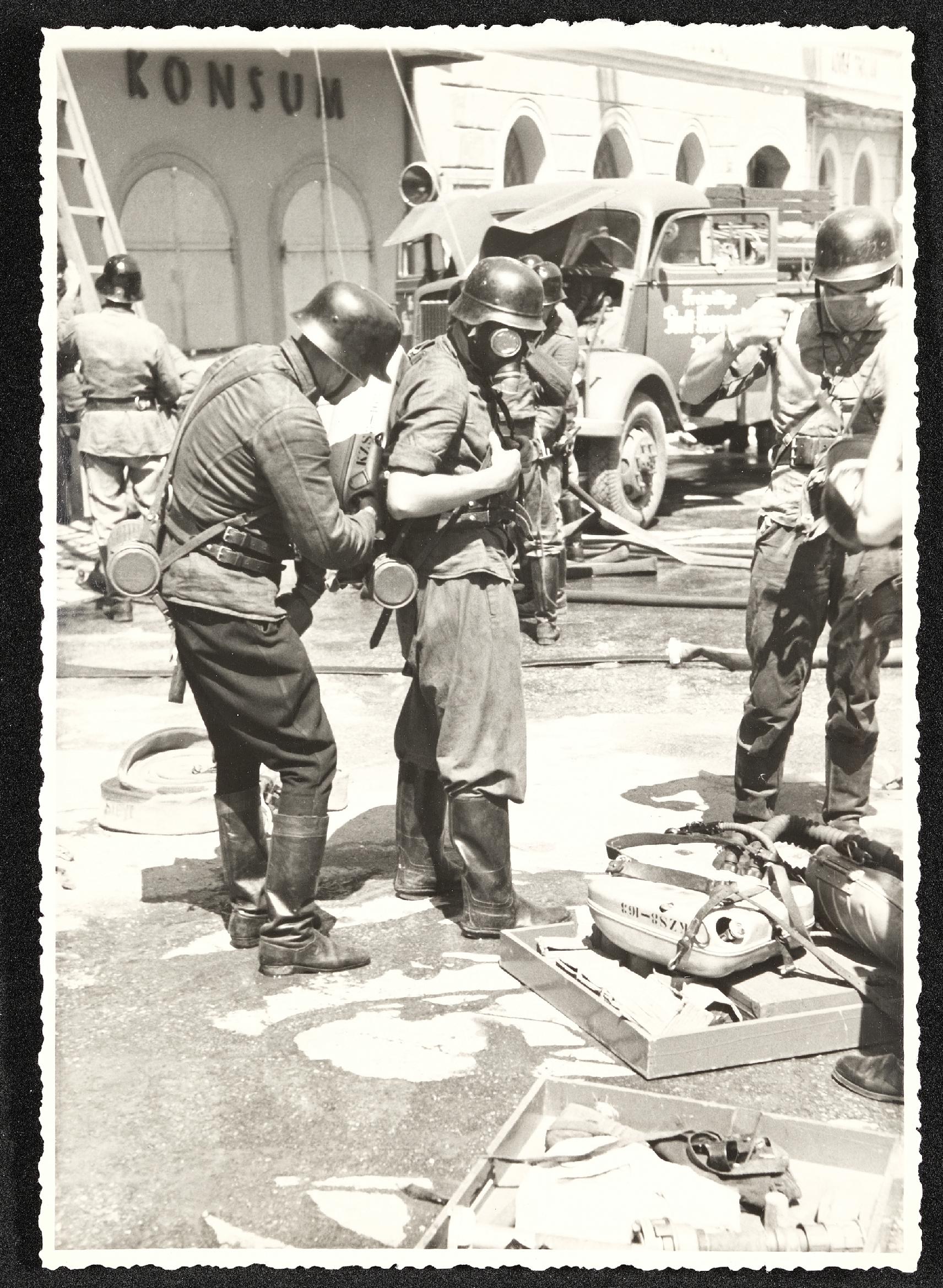 | Beschreibung | Mannschaft der Feuerwehrübung am 7. August 1949, Brandannahme Gebäude am Stadtplatz 30 in Steyr brennt. |