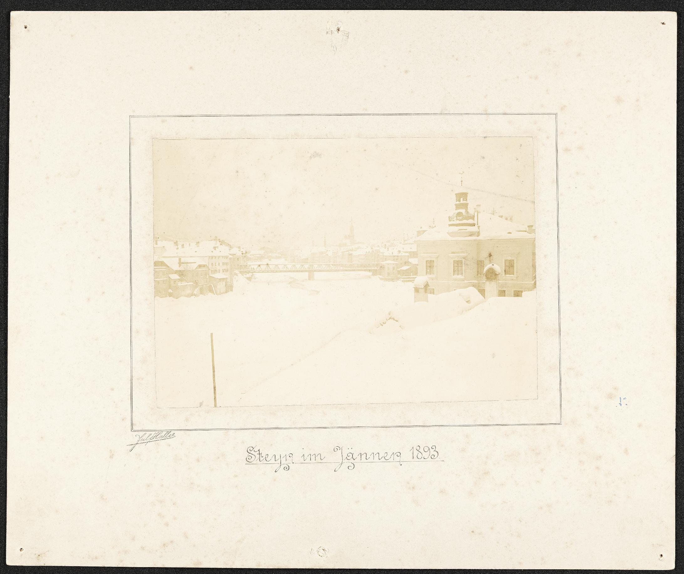 | Beschreibung | Steyr im Jänner 1893. Blick von der Schlüsselhofgasse vorbei beim Haus Michaelerplatz 10 (mit Türmchen) Richtung Ennsbrücke und Stadtpfarrkirche. |