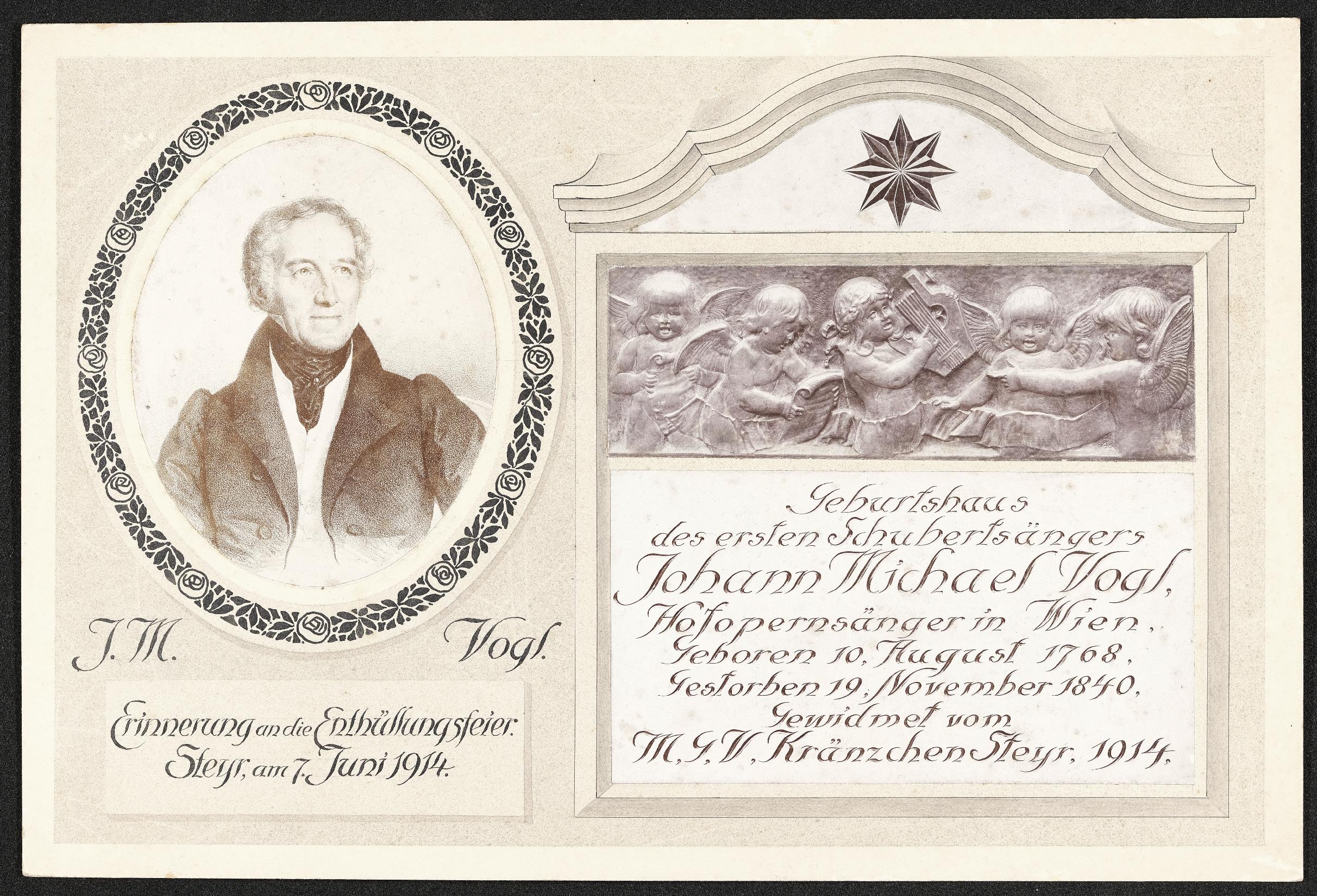 | Beschreibung | 7. Juni 1914 Enthüllung eines Denkmals für Johann Michael Vogl (*10. August 1768, +19. November 1840) an seinem Geburtshaus in der Haratzmüllerstraße 32 in Steyr |