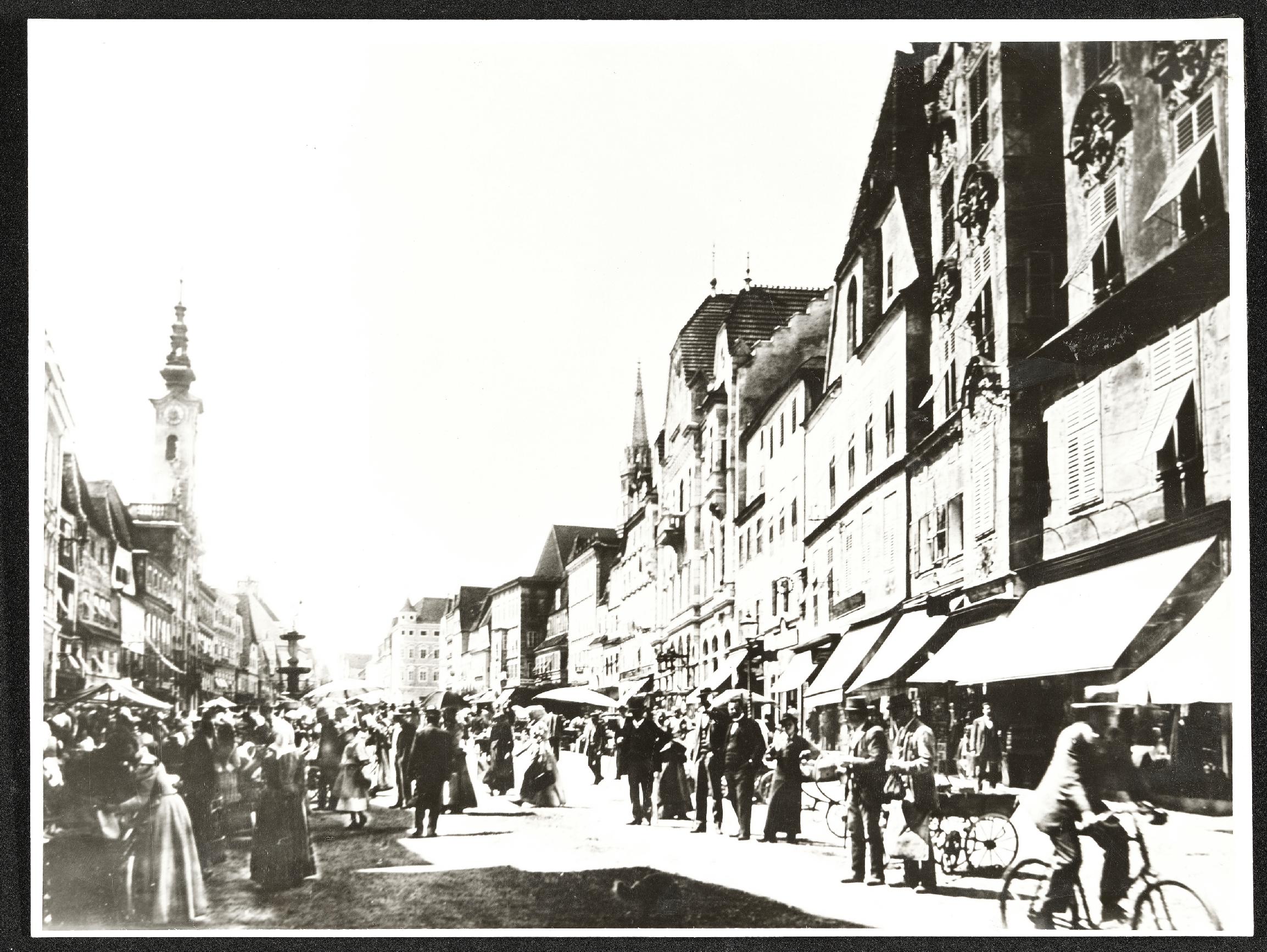 | Beschreibung | Stadtplatz in Steyr mit Markt (zwischen 1918 und 1938) |